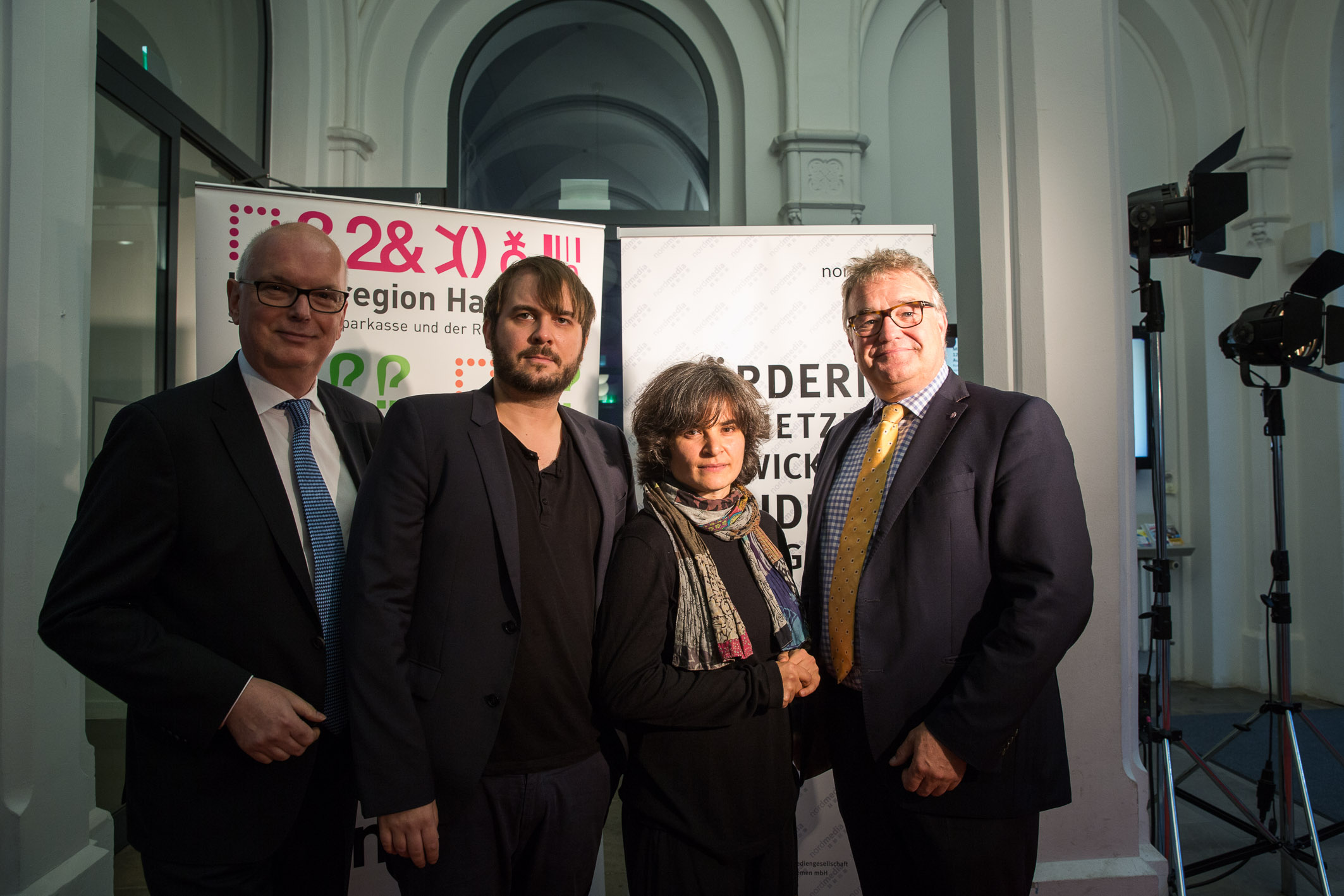 v.l. Thomas Schäffer (Geschäftsführer der nordmedia), Kai Gero Lenke, Anja Großwig und Regionspräsident Hauke Jagau / Bildnachweis: nordmedia/Helge Krückeberg