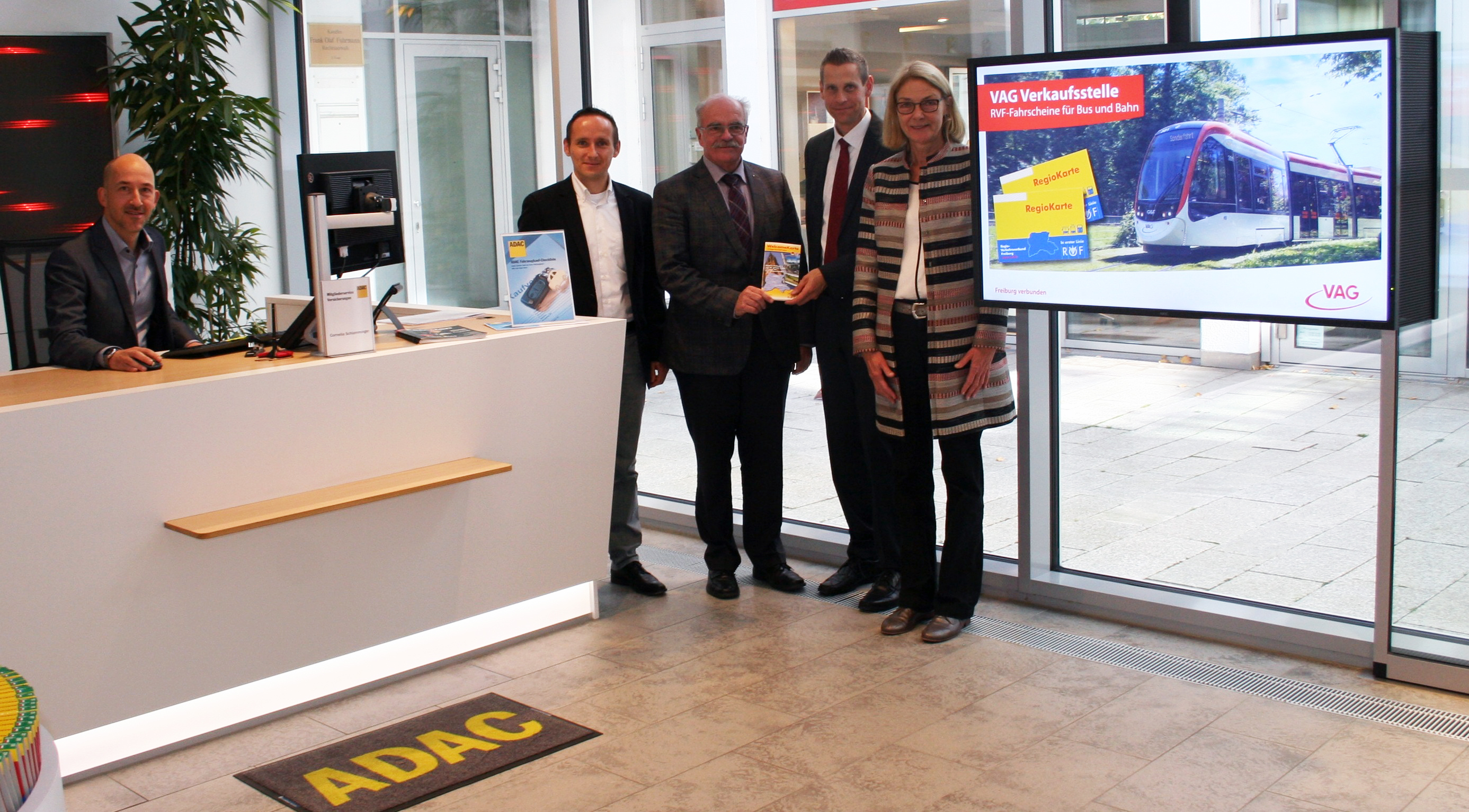 von links: Geschäftsstellenleiter Andreas Müller, Kilian Mandel (Geschäftsführer ADAC Südbaden) Clemens Bieniger (Vorsitzender ADAC Südbaden), Oliver Benz Vorstand VAG und Dorothee Koch Unternehmensbereichsleiterin Vertieb VAG / Quelle: VAG