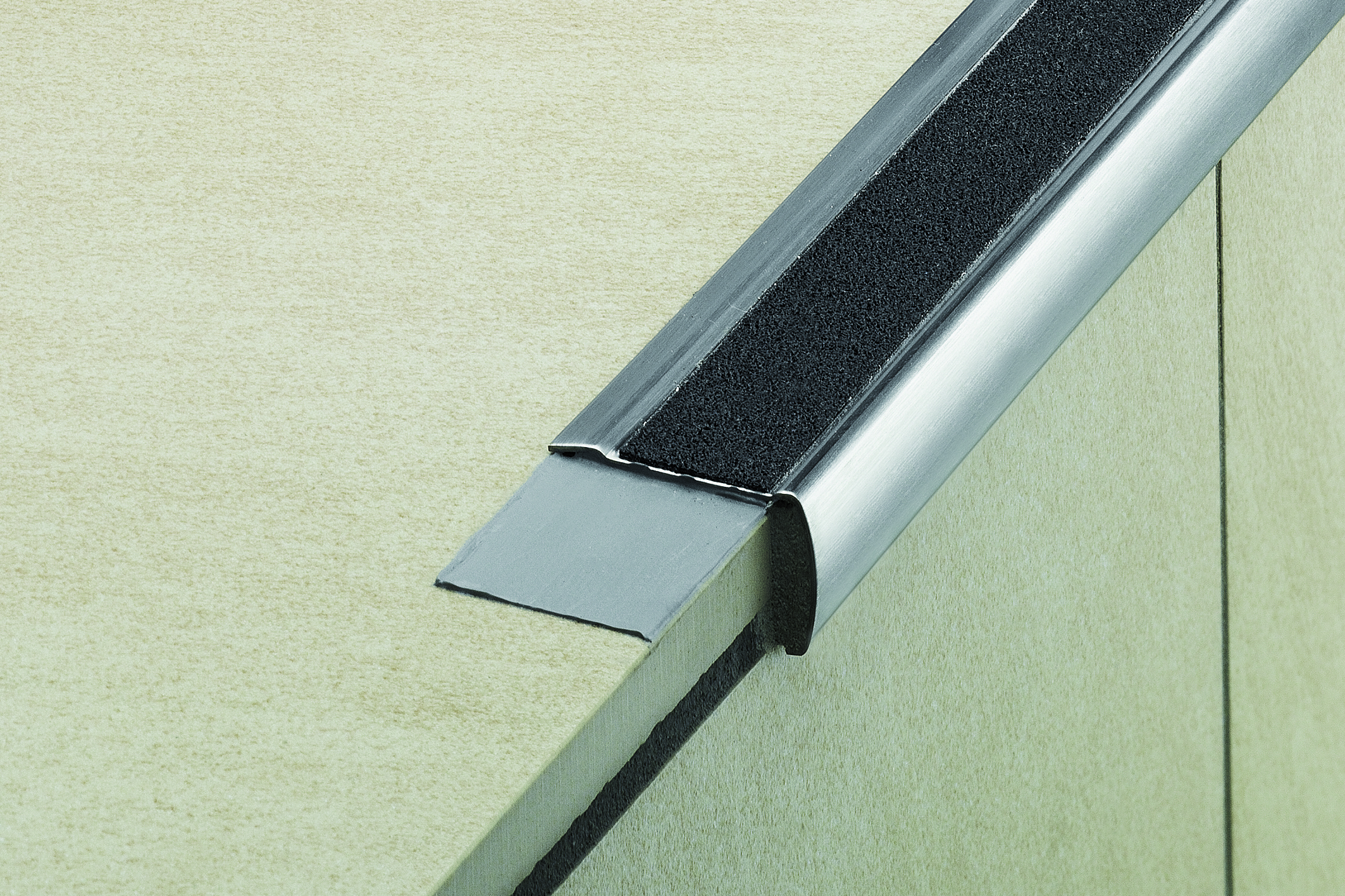 Schlüter-TREP-GK ist eine Variante ohne Befestigungsschenkel mit der höchstmöglichen Rutschhemmung R13. Das Profil eignet sich zum Aufkleben an Stufenkanten.Foto: Schlüter-Systems