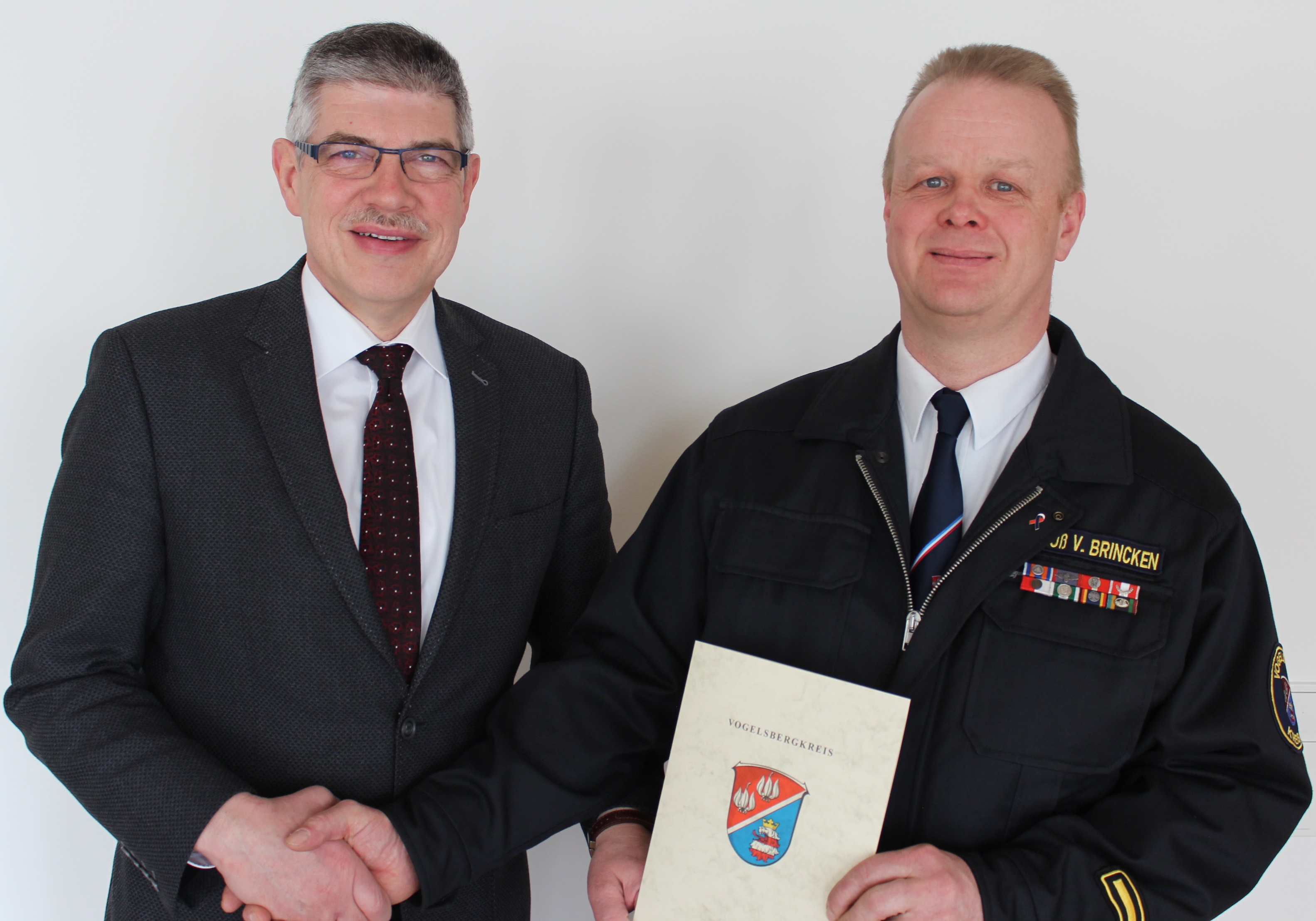 Weiterhin Ehrenbeamter: Der Vogelsberger Kreisbrandmeister Björn Preuß von Brincken erhält aus den Händen von Landrat Manfred Görig die Ernennungsurkunde (Foto: Sabine Galle-Schäfer/Vogelsbergkreis)