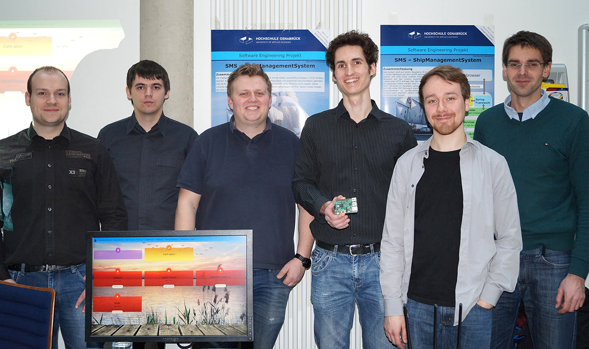 Jens Schuhknecht (rechts), Maschinist auf dem Traditionsschiff „Thor Heyerdahl“, freute sich über ein Computerprogramm, mit dem Informatik-Studierende Wartungsarbeiten und Sicherheitschecks an Bord und an Land unterstützen wollen. Foto: Hochschule Osnabrück / Elisa Stock