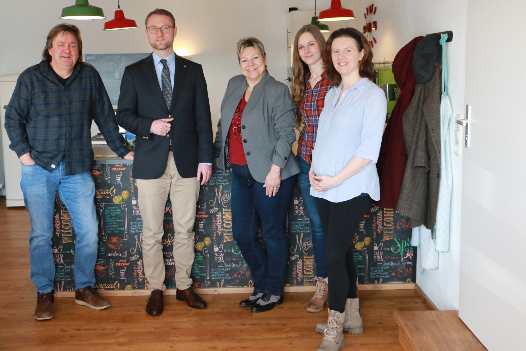 Im neu gestalteten Wohn- und Essbereich (v. l.): Hans Dieter Lange, Dr. Jens Mischak (Jugenddezernent), Dagmar Scherer (Jugendamtsleiterin) und zwei der Mitarbeiterinnen im Kinderhaus Panama, Annika Wanke und Doro Semmler. Fotos: Gaby Richter, Vogelsbergkreis