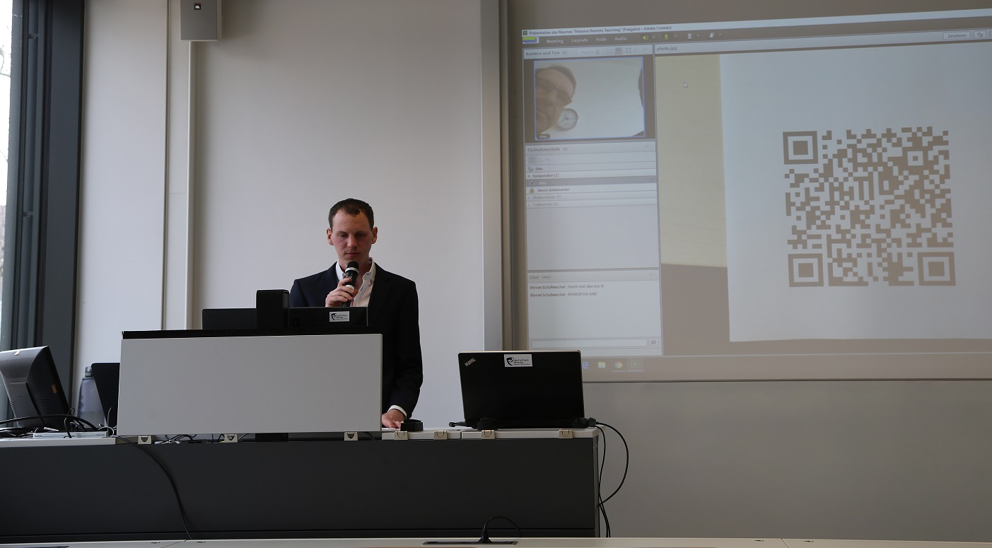 Steven Schuhmacher, verantwortlich für das Projekt "Massive Remote Teachting" an der Hochschule Worms, führt in die neuen Lehrszenarien ein, die mit der erweiterten Technik möglich werden / Foto/Hochschule Worms