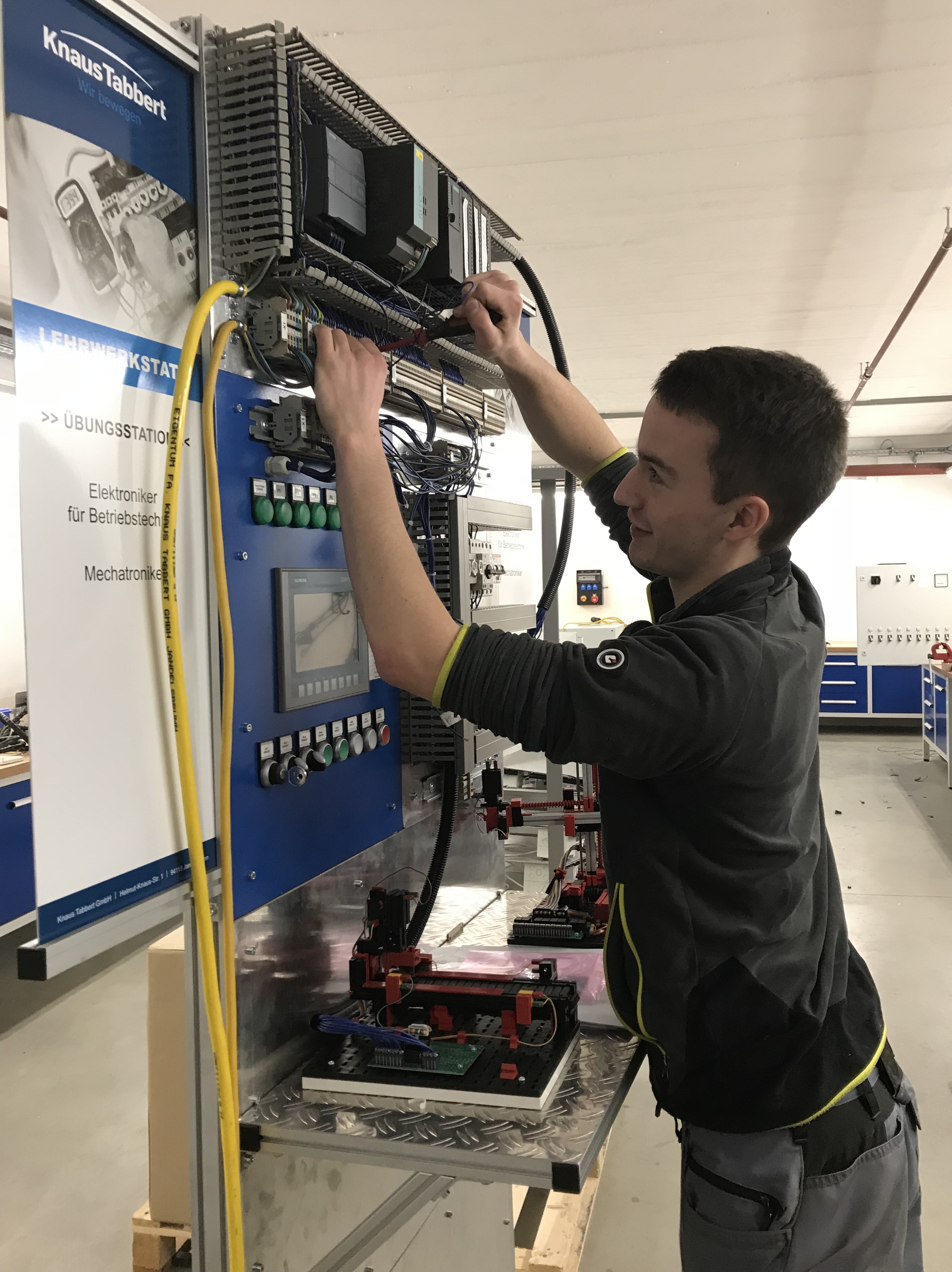 Der angehende Mechatroniker Alexander Maier arbeitet an der Schaltschrank-Übungsstation. Er ist bereits am Ende seiner Ausbildung und möchte künftig gerne im Bereich Instandhaltung tätig sein, Fotos: Knaus Tabbert GmbH