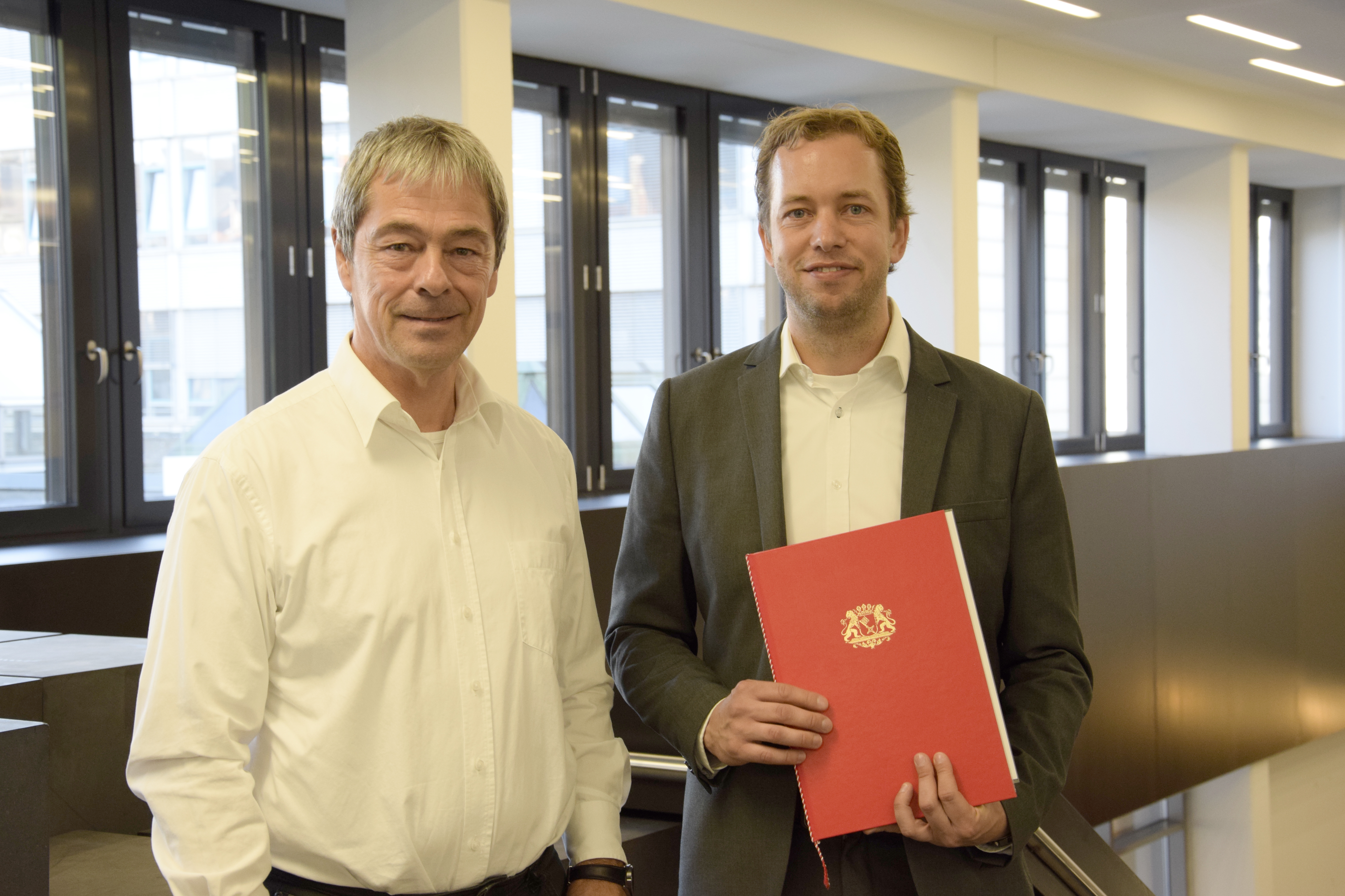 Es zeigt Prof. Dr. Stefan Veltel mit dem ehemaligen Konrektor für Studium und Lehre, Prof. Dr. Axel Viereck, bei der Übergabe der Ernennungsurkunde / Foto: Hochschule Bremen / Sascha Peschke