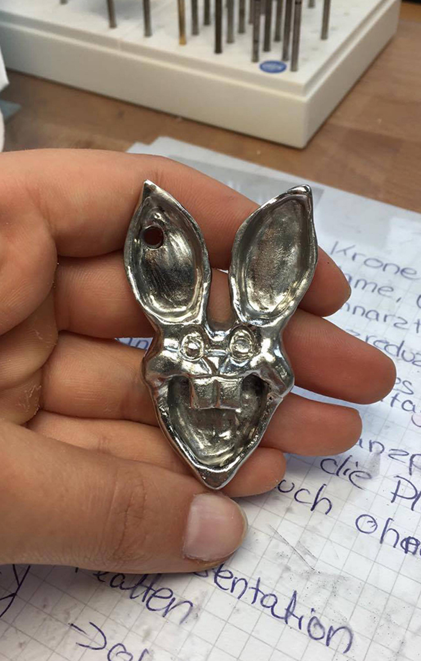 Schlüsselanhänger und Flaschenöffner zugleich ist dieser Osterhase aus recyceltem Metall, den Studierende der Hochschule Osnabrück entwickelt haben (rechts - der fertige Prototyp, links - Entwurf aus Wachs). (Foto: Hochschule Osnabrück)