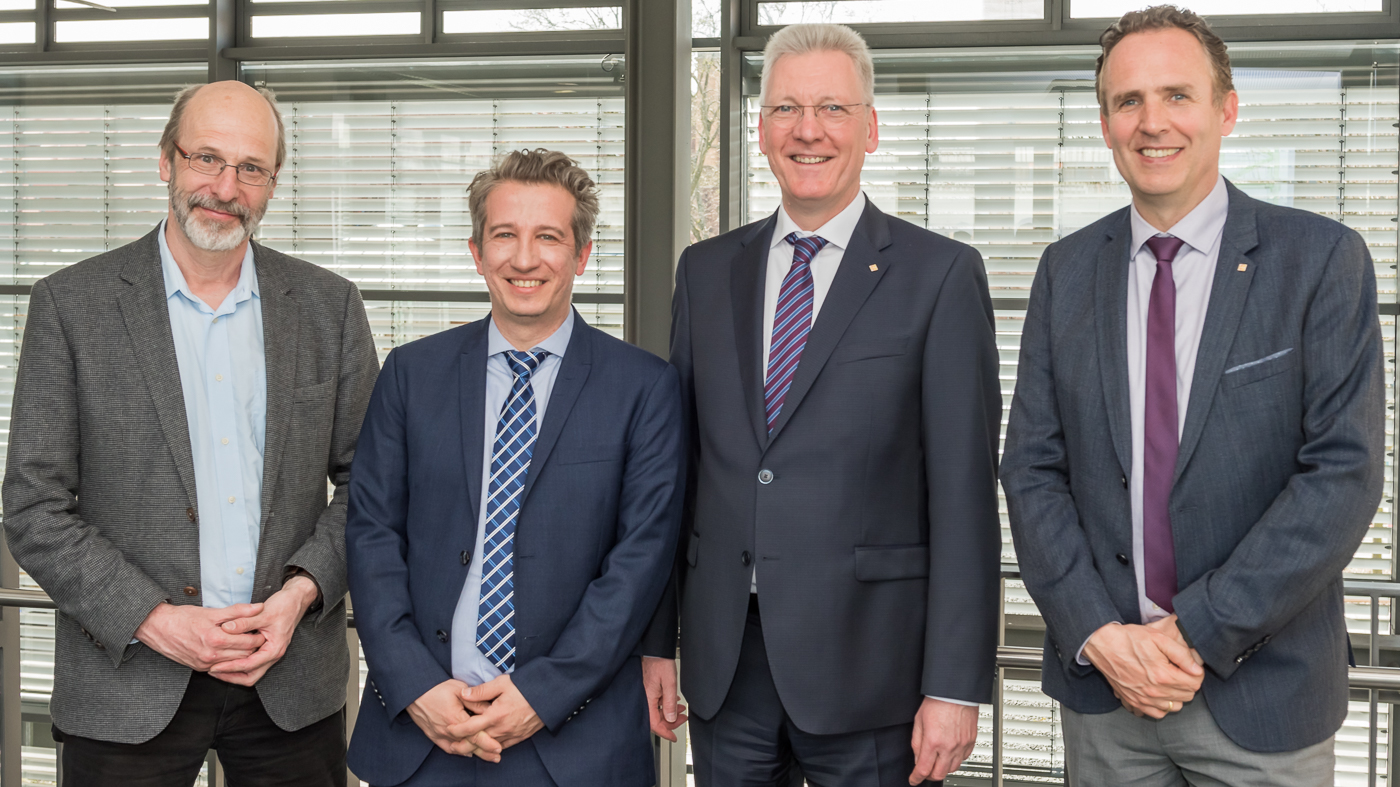 Amtsantritt 3.4. Prof. Dr. Dogu Teber, Urologische Klinik; Personen v.l.n.r.: Klaus Stapf, Prof. Dr. Dogu Teber, Prof. Dr. Hans-Jürgen Hennes, Markus Heming / Bildquelle: Markus Kümmerle, Städtisches Klinikum Karlsruhe