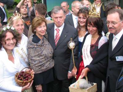 Bundespräsident Horst Köhler mit seiner Frau Eva-Luise (3. v. r.) sowie BBV-Präsident Gerd Sonnleitner beim Deutschen Bauerntag 2007 am 28. Juni in Bamberg umringt von verschiedenen Produktköniginnen