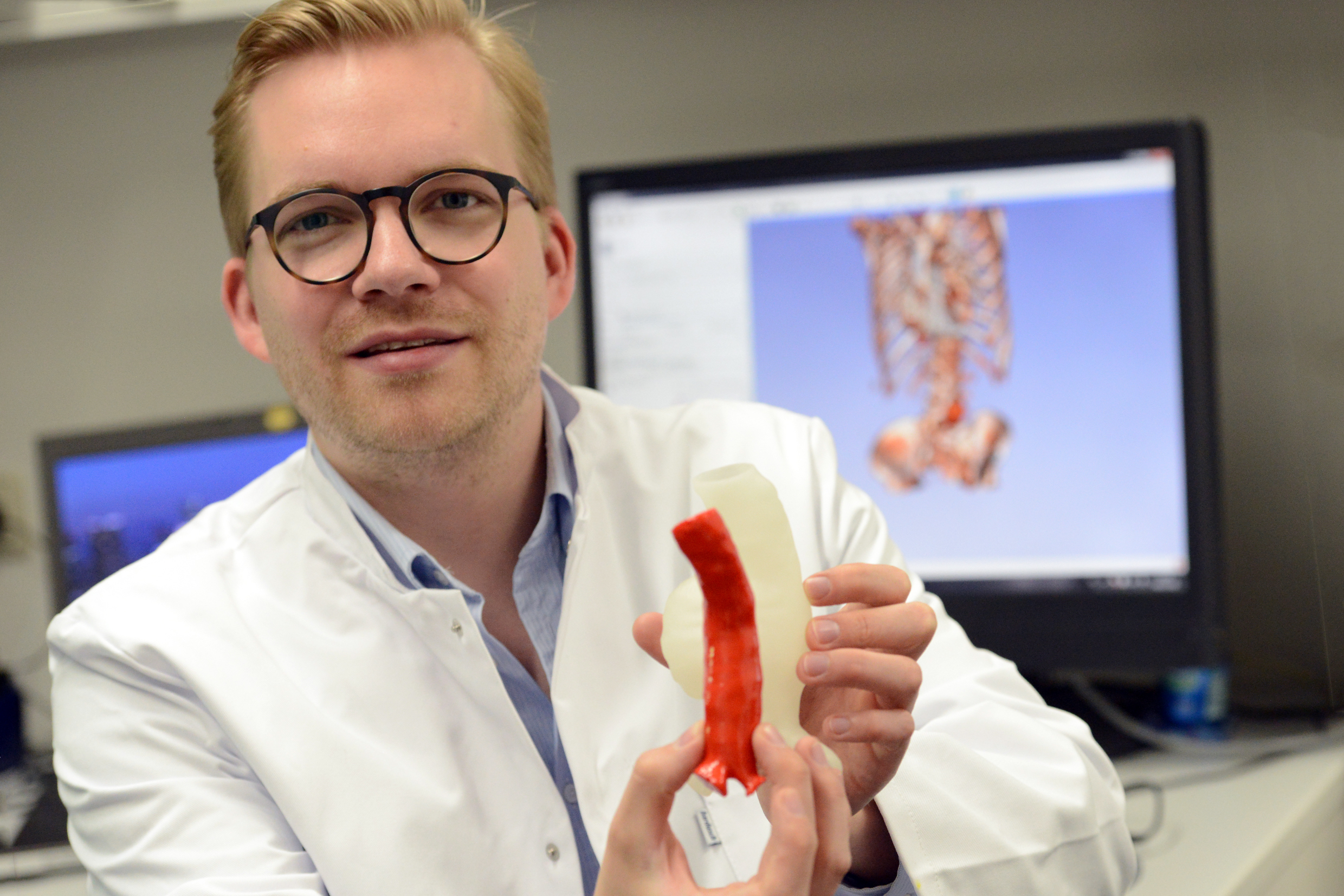 3-D-Druck-Modell eines Gefäßaneurysmas (weiß) und der Form der späteren Gefäßprothese (rot) in den Händen von Dr. med. Nikolaus Thierfelder, Labor für Tissue Engineering, Herzchirurgische Klinik und Poliklinik, Klinikum der Ludwig-Maximilians-Universität (LMU) München, Campus Großhadern / Foto: Andreas Steeger/Klinikum der LMU München