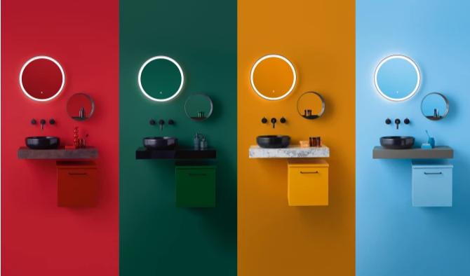 Sys30 jetzt mit mutigen Farbvarianten und edlen Furnieren: Mit der Palette der zwölf Trendfarben Champagner, Mint, Senf, Orange, Altrosa, Rot, Dunkelrot, Hellgrün, Grün, Hellblau, Nachtblau und Schwarz wird die Badgestaltung zum Farbrausch: Starke Akzente setzen, Kontraste zeichnen oder lieber Ton-in-Ton arrangieren, Farbverläufe malen, Gute-Laune-Inseln schaffen oder die Badausstattung mit der Architektur verschmelzen lassen – alles ist möglich / Foto: burgbad AG