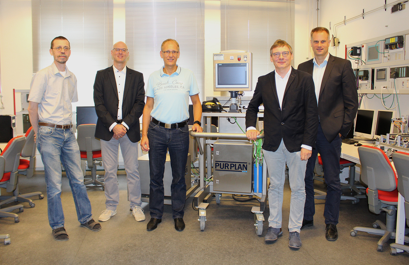 „Eine gigantische Hilfe“: Das Familienunternehmen Purplan aus Wallenhorst hat der Hochschule Osnabrück für fachübergreifende Praktika und Projekte eine Dosieranlage im Industrieformat überlassen. Von links: Bernhard Neugebauer, Prof. Siegmar Lampe, Frank Kamper (Purplan), Prof. Frank Thiesing, Prof. Alexander Schmehmann(Foto: Hochschule Osnabrück / Lidia Wübbelmann)