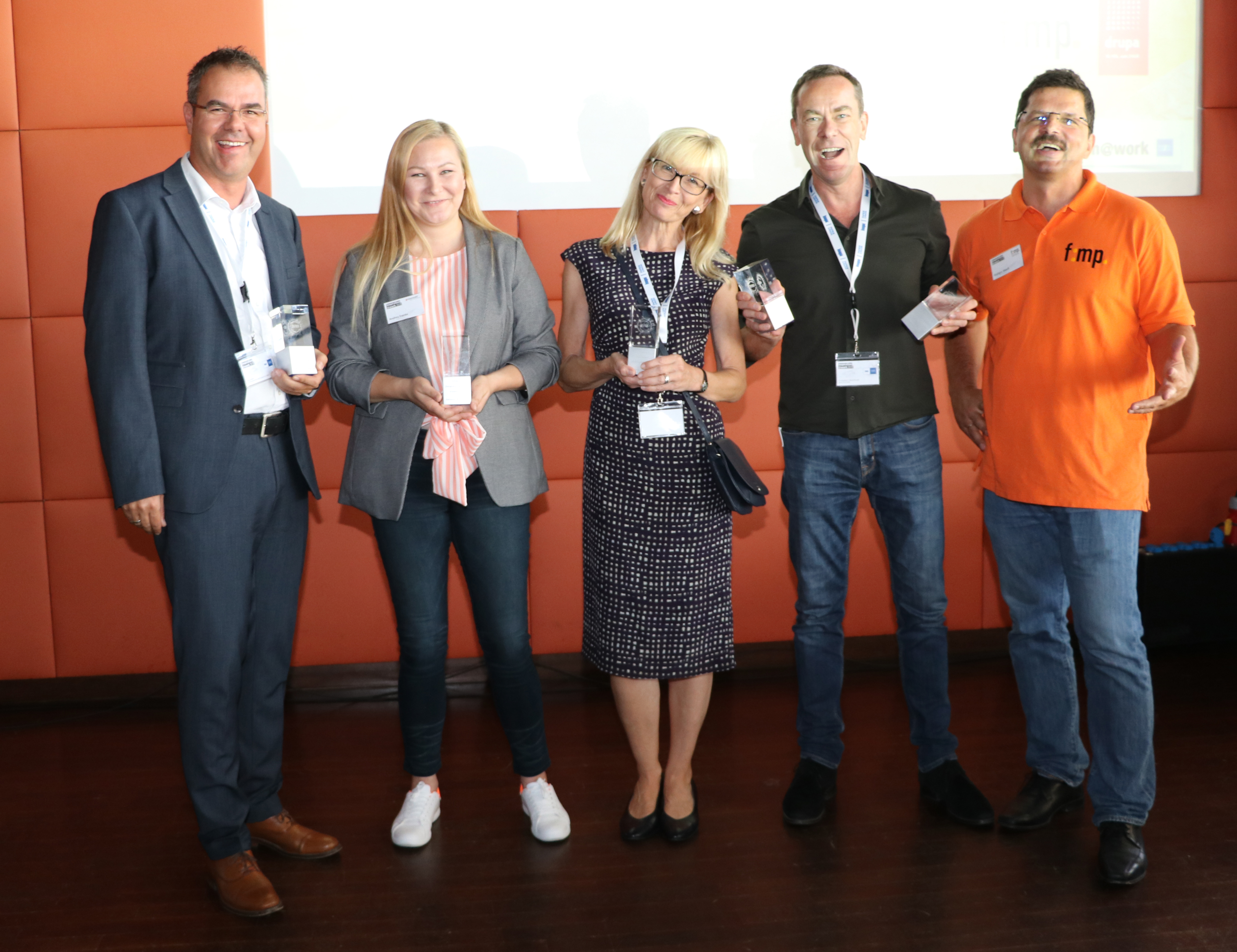 Edelmeister-Award-Gewinner 2018 (v.l.n.r. Bernd Weber, Gotteswinter und Aumaier GmbH - Andrea Franke, Grunewald GmbH - Bettina Bürger, KOLBUS GmbH & Co. KG - Christopher C. Mickelthwate, DIALOGISTIKER GmbH - Rüdiger Maaß, Fachverband Medienproduktion e.V.