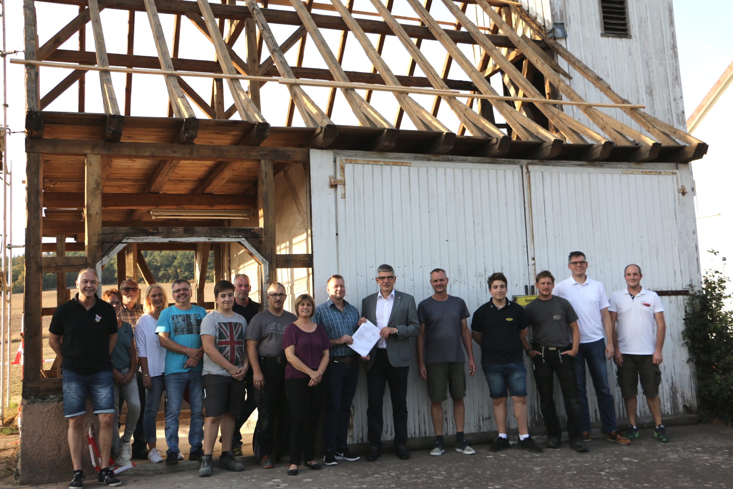 Richtig viel vorgenommen haben sich die Allmenröder Vereine: Das alte Spritzenhaus soll saniert werden. Landrat Manfred Görig (Mitte) überreichte dafür eine Spende der OVAG in Höhe von 3.000 Euro an Ortsvorsteher Jörg Hauer. Foto: Gaby Richter