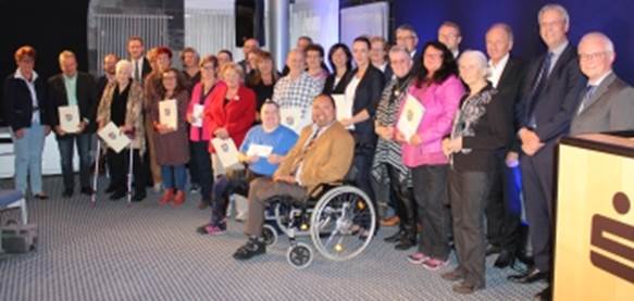Feierstunde aus Anlass des Jubiläums "10 Jahre Familienbündnis". Unser Foto zeigt die Gruppe der Geehrten aus dem Wettbewerb "Gute Beispiele im Ehrenamt". Der Vertreter des Bundesfamilienministeriums, Dr. Thomas Metker (Zweiter von rechts), der die Glückwünsche von Familienministerin Dr. Franziska Giffey überbrachte und die Festrede hielt, zeigte sich sehr beeindruckt von den Aktivitäten im Vogelsbergkreis. Foto: Erich Ruhl-Bady
