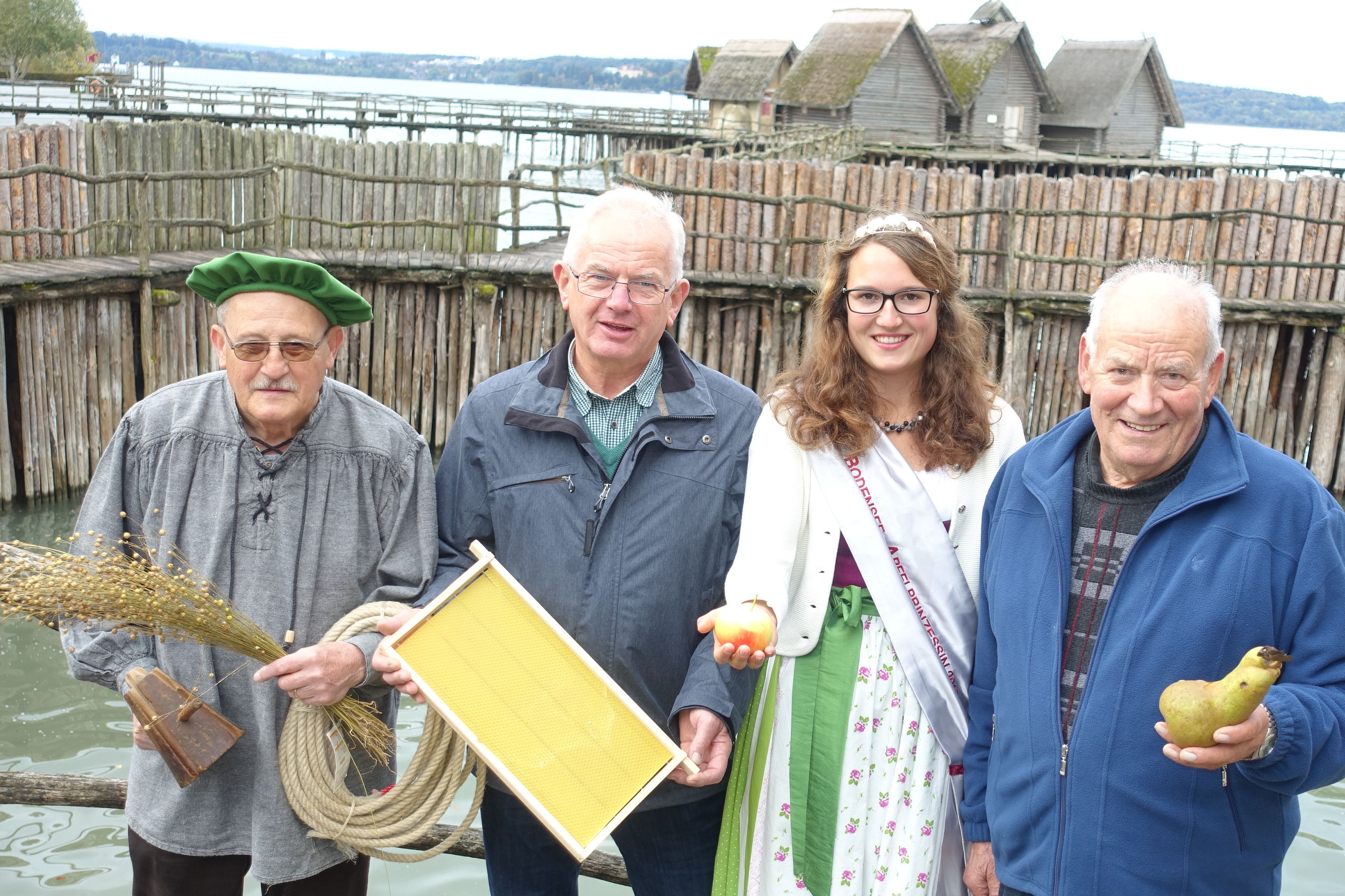 v.l.n.r. Seiler Karl Stehle, Imker Siegfried Hamburger, Bodensee Apfelprinzessin Lisa Brielmayer und Pommologe Konrad Hauser
