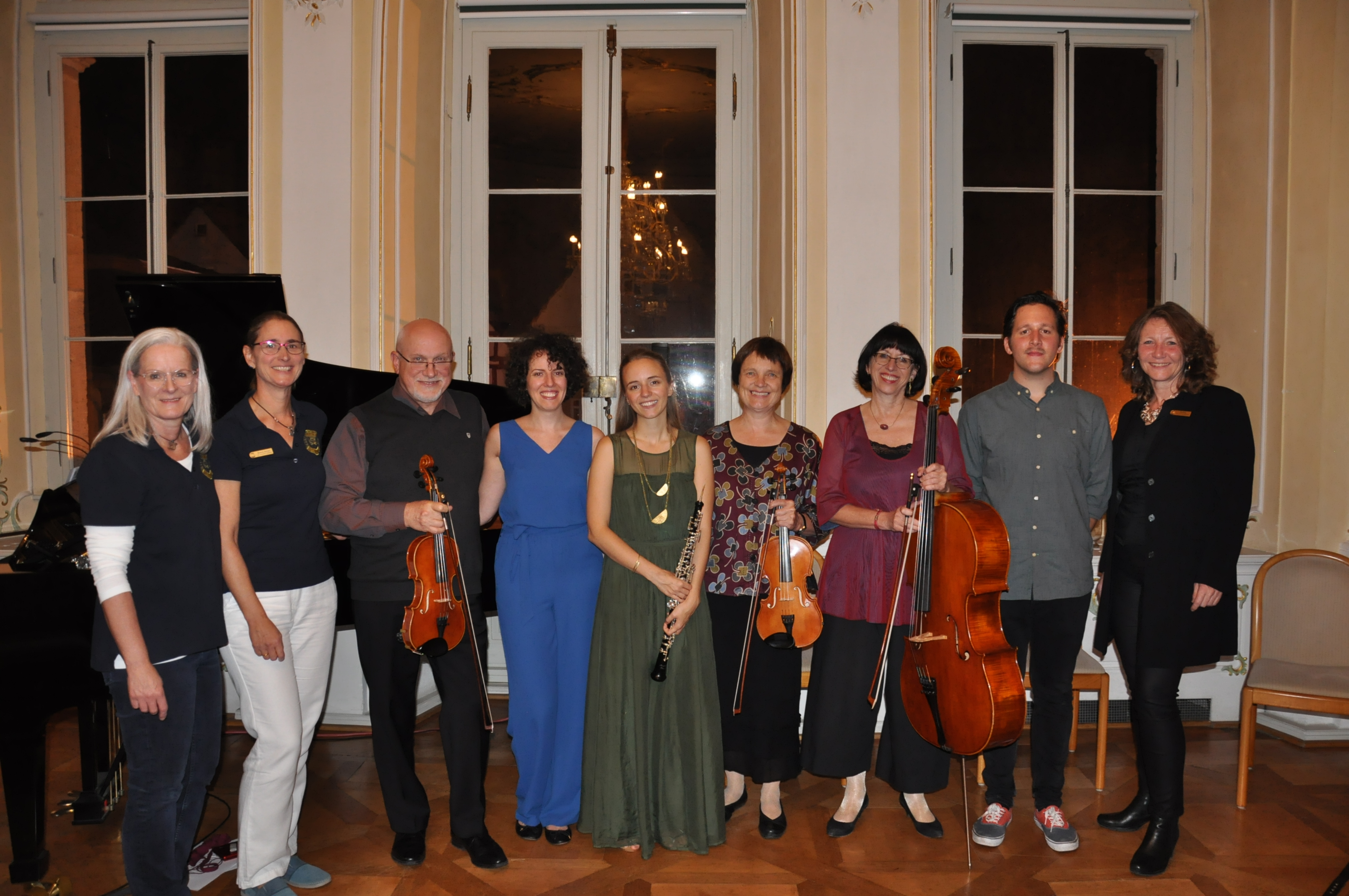 v.l. Annette Deibel (musikkulturschule/SI), Susanne Bolduan (SI-Präsidentin), Wladimir Pletner, Katharina Khodos, Miriam Green, Felicia Eisenmeier, Sophia Mott, Simon Popp, Ute Kirst (Projektleiterin „Nie wieder Krieg!“ SI), Foto: Ströher