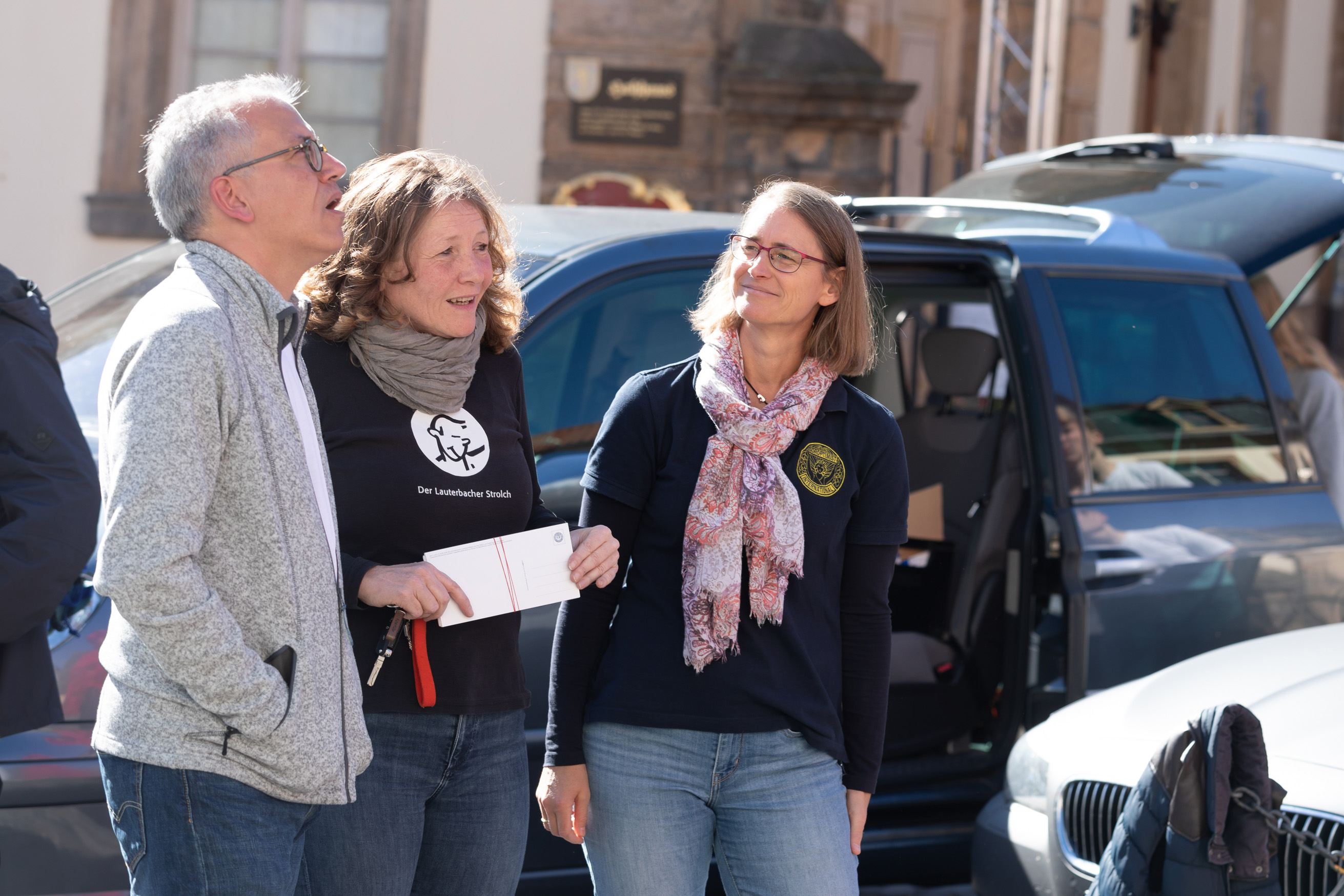 Noch kurz vor der Enthüllung: "Nie wieder Krieg!" Projektleiterin Ute Kirst (mit SI-Lauterbach-Vogelsberg Präsidentin Susanne Bolduan) erläutert dem hessischen Wirtschaftsminister Tarek AL-Wazir das SI-Projekt rund um den Friedenslöwen / Foto: Lutz Habekost