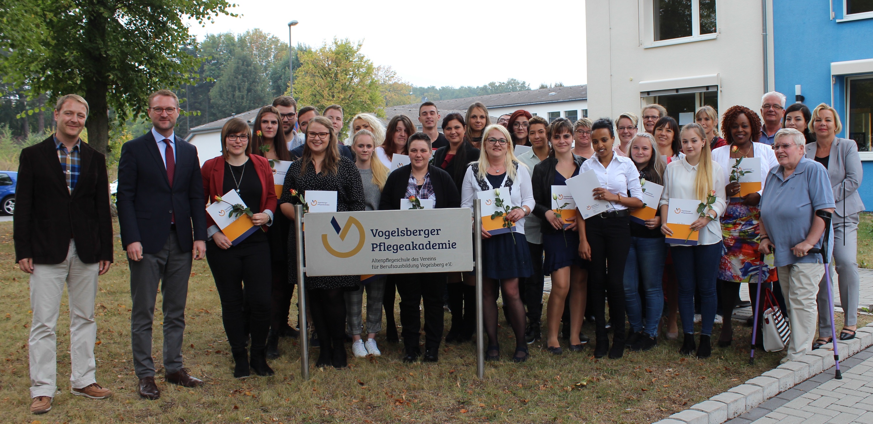 Schulleiter Thomas Müller und Erster Kreisbeigeordneter Dr. Jens Mischak (links) sowie Dozenten und Lehrkräfte verabschiedeten die examinierten Aktenpfleger und die Altenpflegehelfer / Foto: Sabine Galle-Schäfer/Vogelsbergkreis