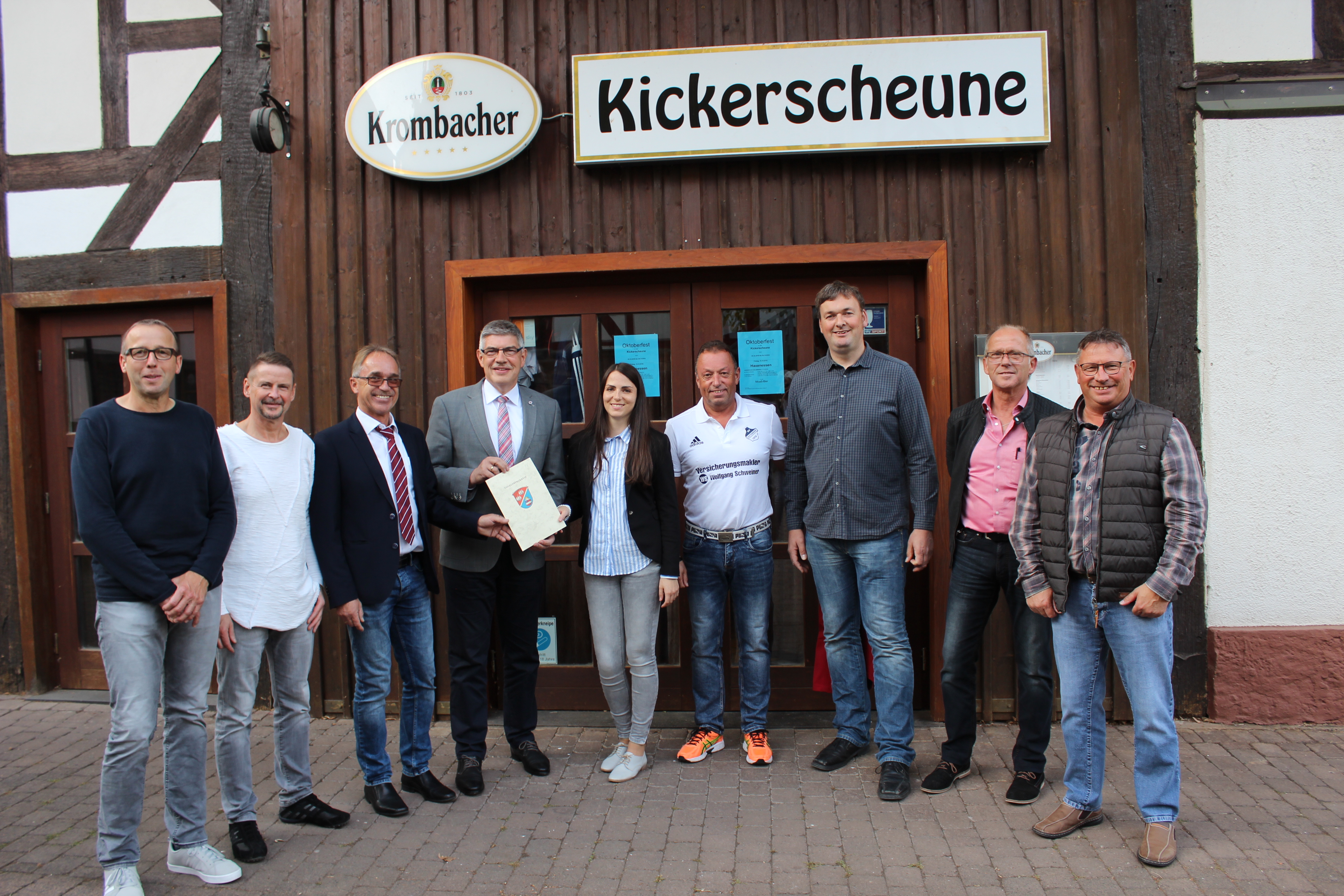 Gut lachen haben die Mitglieder des SV Hattendorf: Landrat Manfred Görig (Vierter von links) hat bei seinem Besuch in dem Alsfelder Stadtteil einen Bewilligungsbescheid dabei. Der SV bekommt mehr als 8600 Euro aus Mitteln der Sportförderung / Foto: Sabine Galle-Schäfer/Vogelsbergkreis