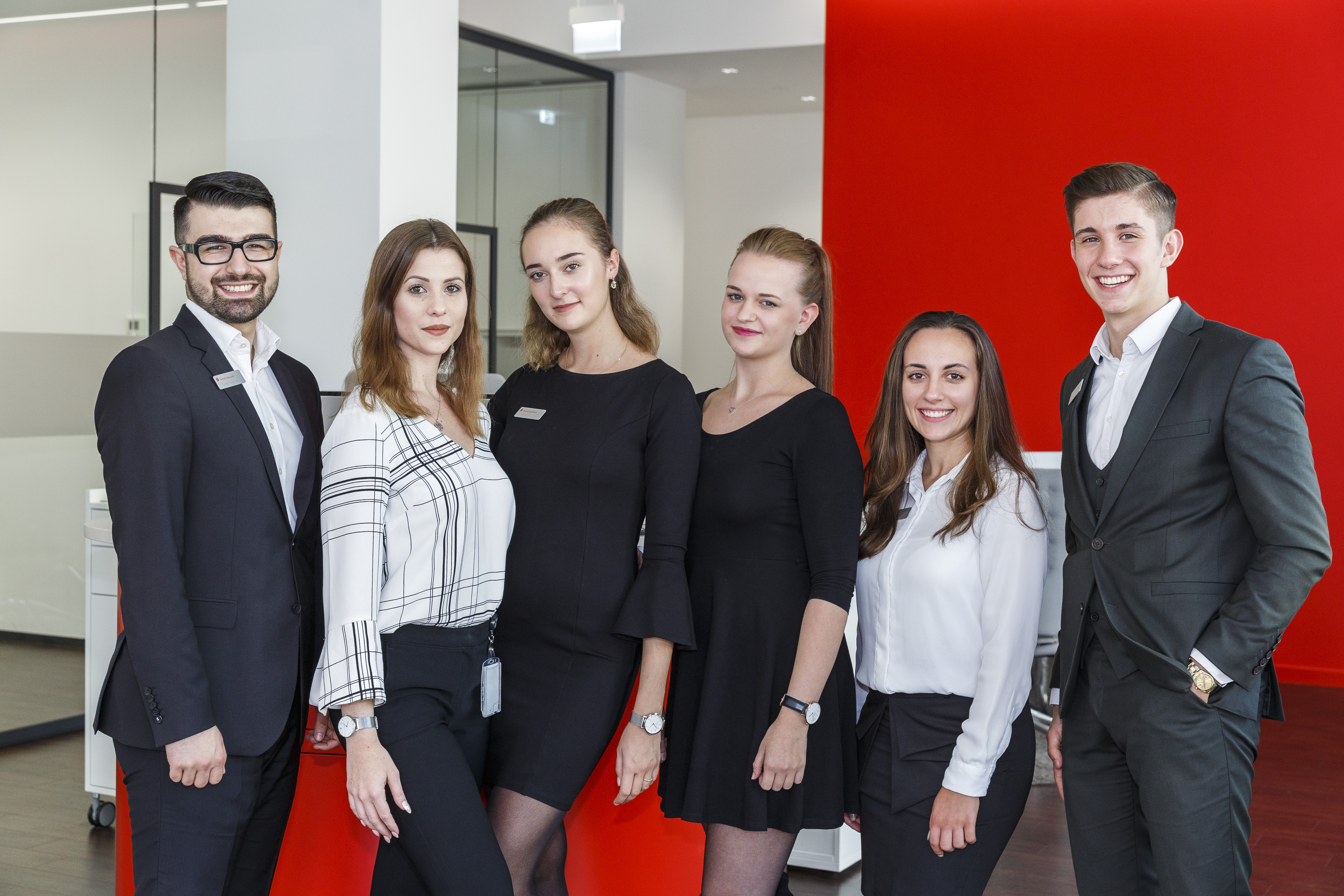 Das Team der Azubi-Filiale Camp King (v.l.n.r.): Caner Topyürek, Larissa Erker, Clara Sophie Biegi, Lisa Herzog, Elena Cotruta und Anthony Lollegni