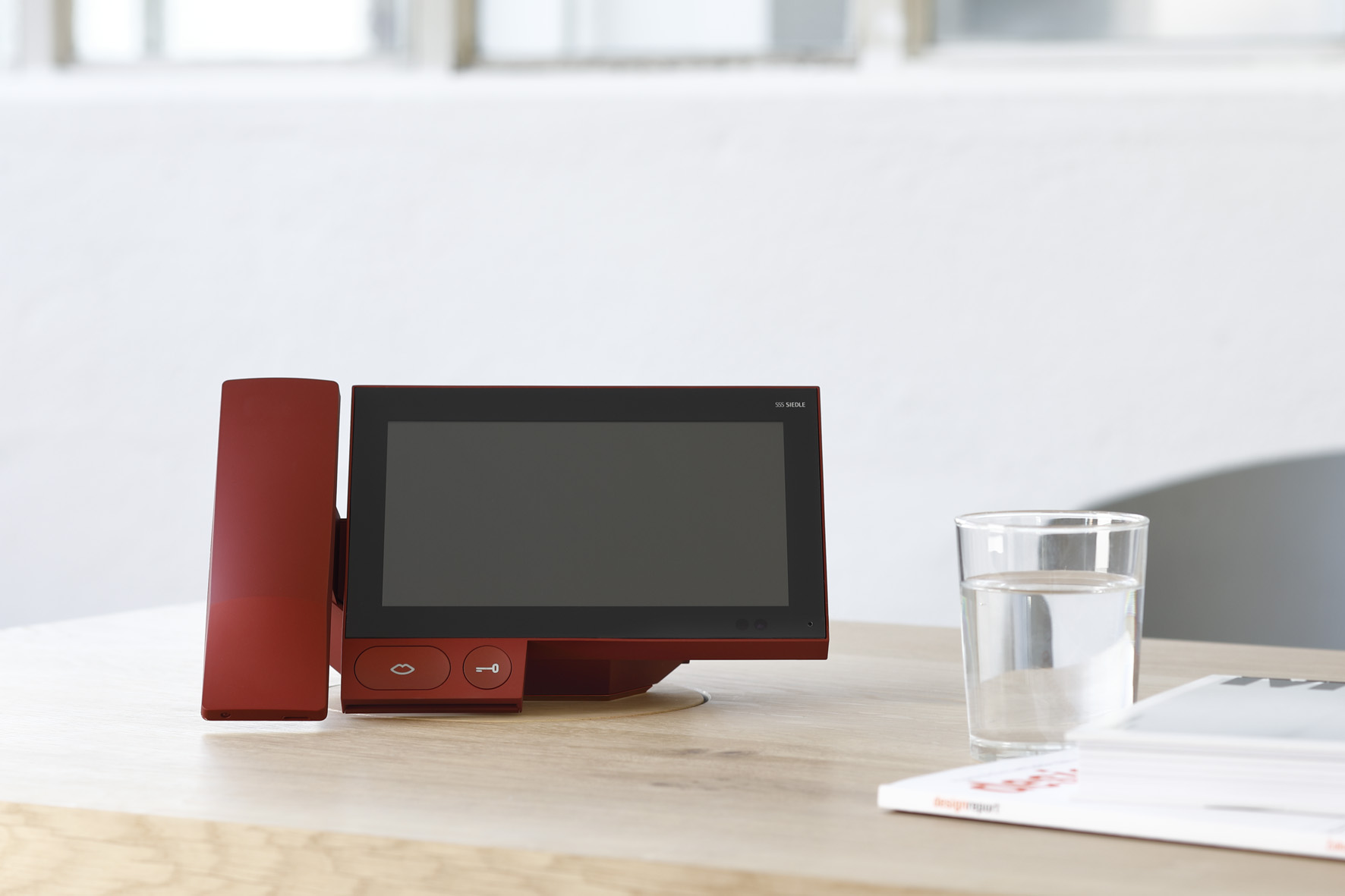 Designpreis „Focus Silver“ für Siedle Axiom: das Panel in Perlrubinrot in der Variante als fest installiertes Tischgerät mit Möbeladapter und Hörer