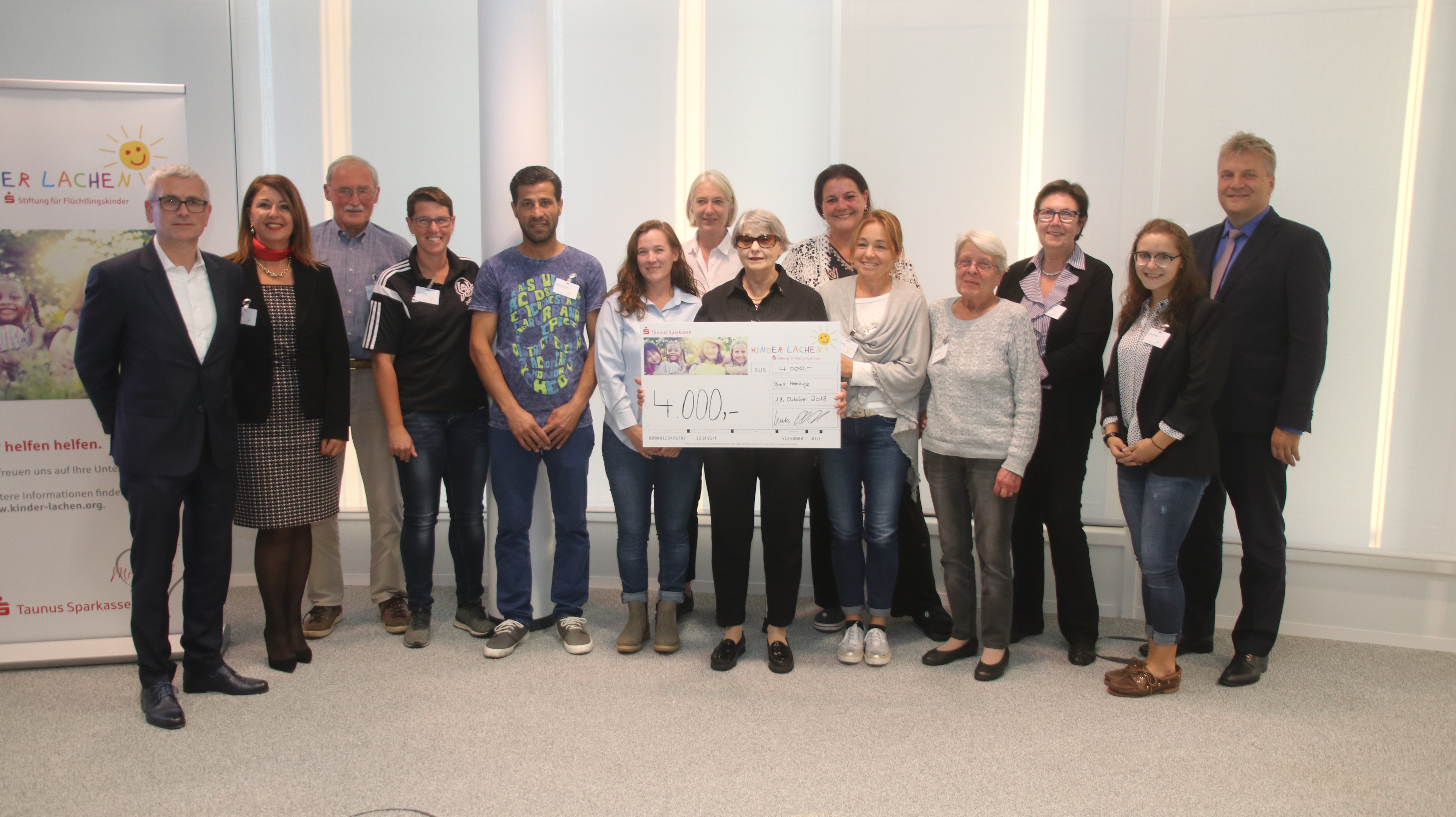 Oliver Klink, Vorstandsvorsitzender der Taunus Sparkasse (links), die Stiftungsbotschafterin der Taunus Sparkasse für den Hochtaunuskreis, Semin Sona (2.v.l.), und Landrat Ulrich Krebs (rechts) mit den Vertretern der drei Projekte bei der Spendenübergabe in der Ludwig-Erhard-Anlage