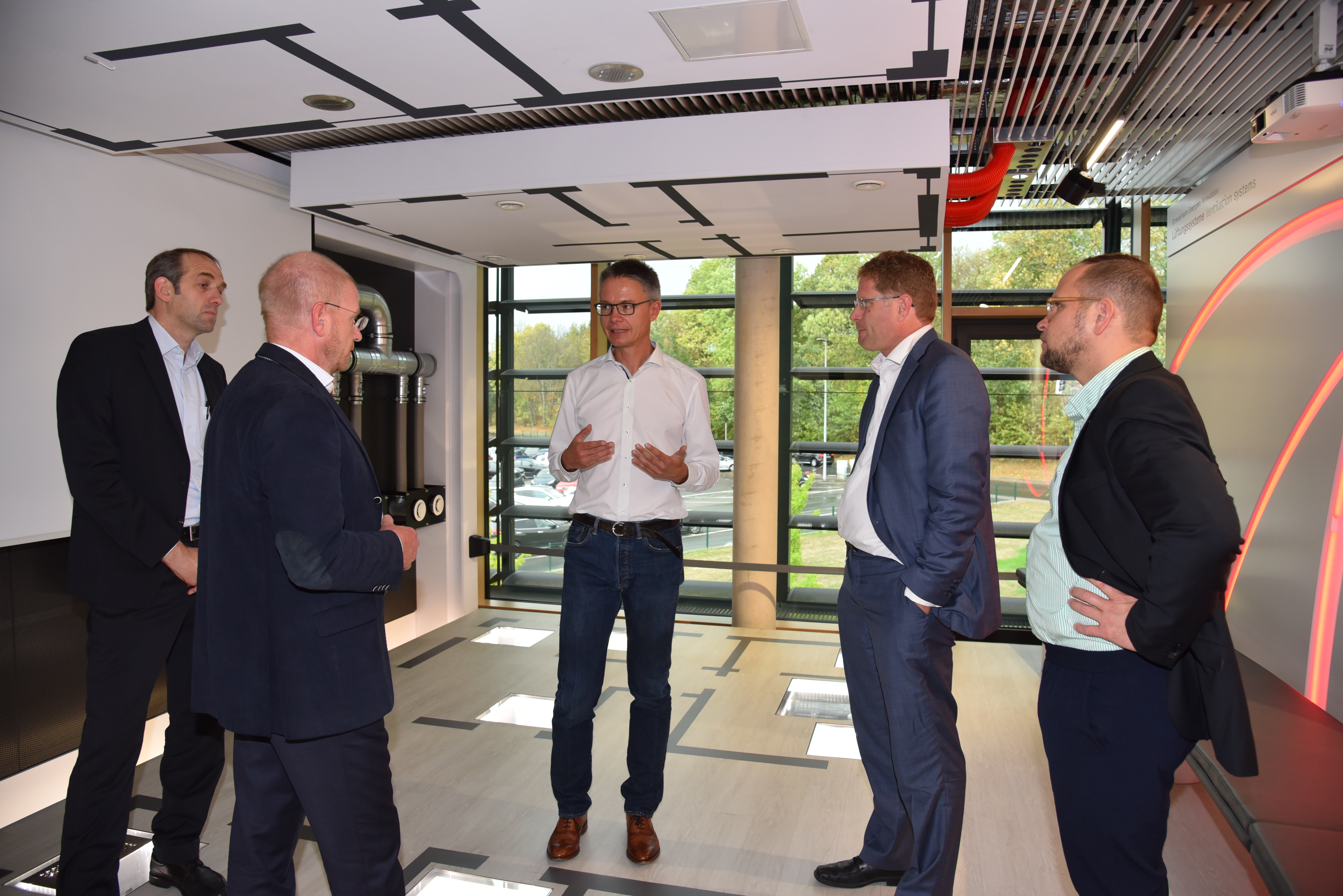 Dr. Kai Schiefelbein (Mitte) erläuterte Dr. Patrick Graichen (2. von rechts) im Praxisraum Lüftung die Vorzüge der kontrollierten Wohnungslüftung mit Wärmerückgewinnung