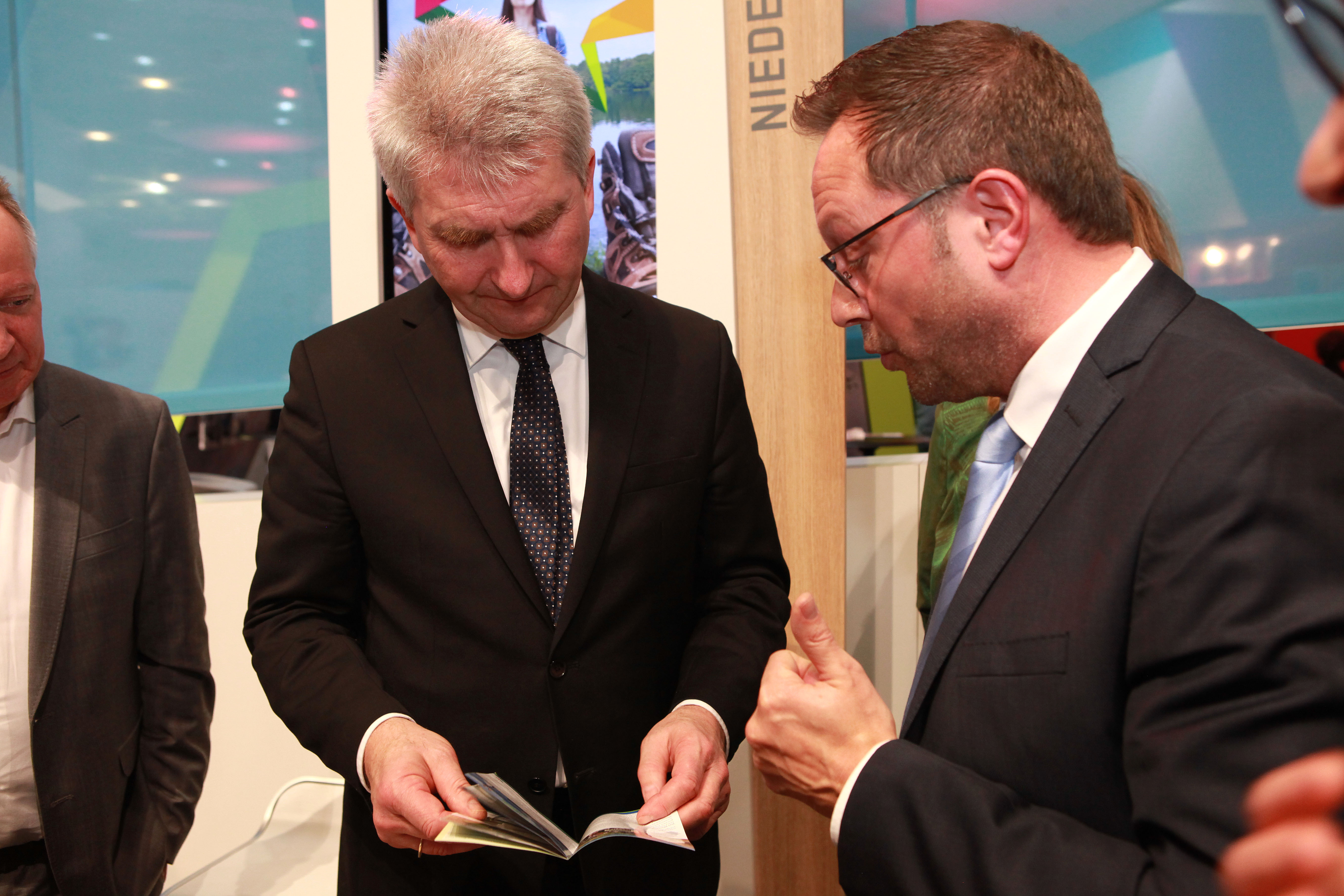 Thomas Görtz, FZX-Geschäftsführer, mit NRW-Wirtschaftsminister Andreas Minister Pinkwart am Messestand des Freizeitzentrums Xanten auf der ITB-Berlin 2019 / Quelle: Freizeitzentrum Xanten GmbH