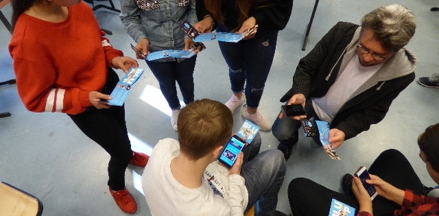 Dirk Höllerhage zeigt Schülerinnen und Schülern bei einem Schuleinsatz den Umgang mit der blu:app / Foto: BKD
