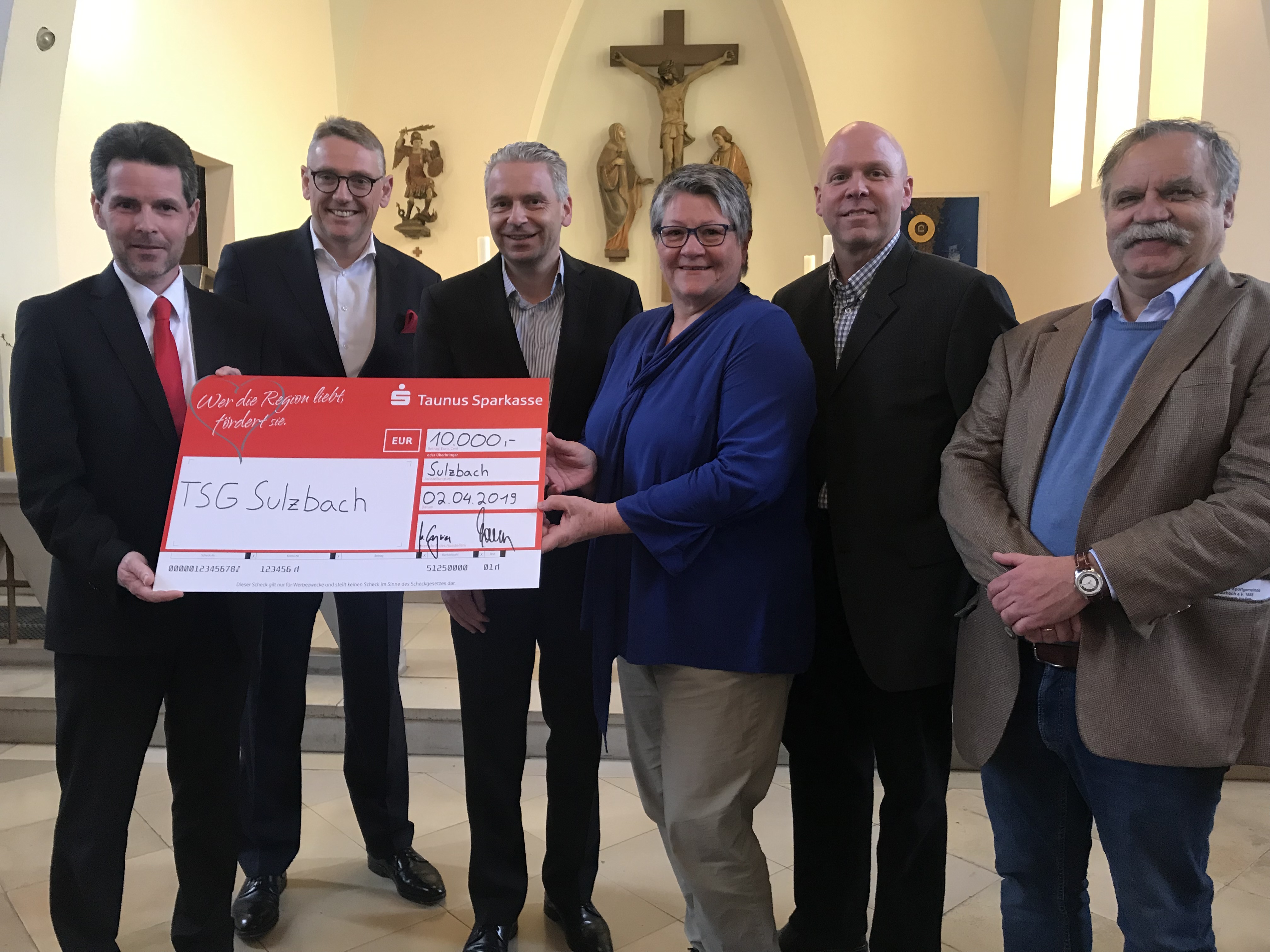 v.l.n.r.: Eric Hemmerling, Leiter der Filiale Kelkheim der Taunus Sparkasse, Markus Franz, Mitglied des Vorstands der Taunus Sparkasse, und Landrat Michael Cyriax übergeben den Spendenscheck an Inge Rohs, 1. Vorsitzende der TSG Sulzbach, Malte Kunga, 2. Vorsitzender, und Abteilungsleiter Volkhard Schlotte.