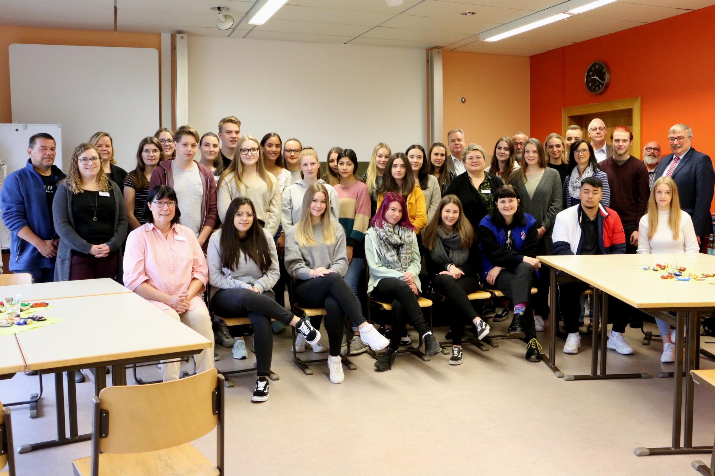 Die 27 Auszubildenden, die Gesundheits- und Krankenpfleger/in werden wollen, wurden von Schulleiterin Christiane Schwind (stehend, 5. v. re.), Hans Jürgen Herbst (re.) sowie von Krankenhaus-Geschäftsführer Ingo Breitmeier und weiteren Vertretern der Krankenhäuser in Lauterbach und Alsfeld begrüßt / Foto: Gaby Richter