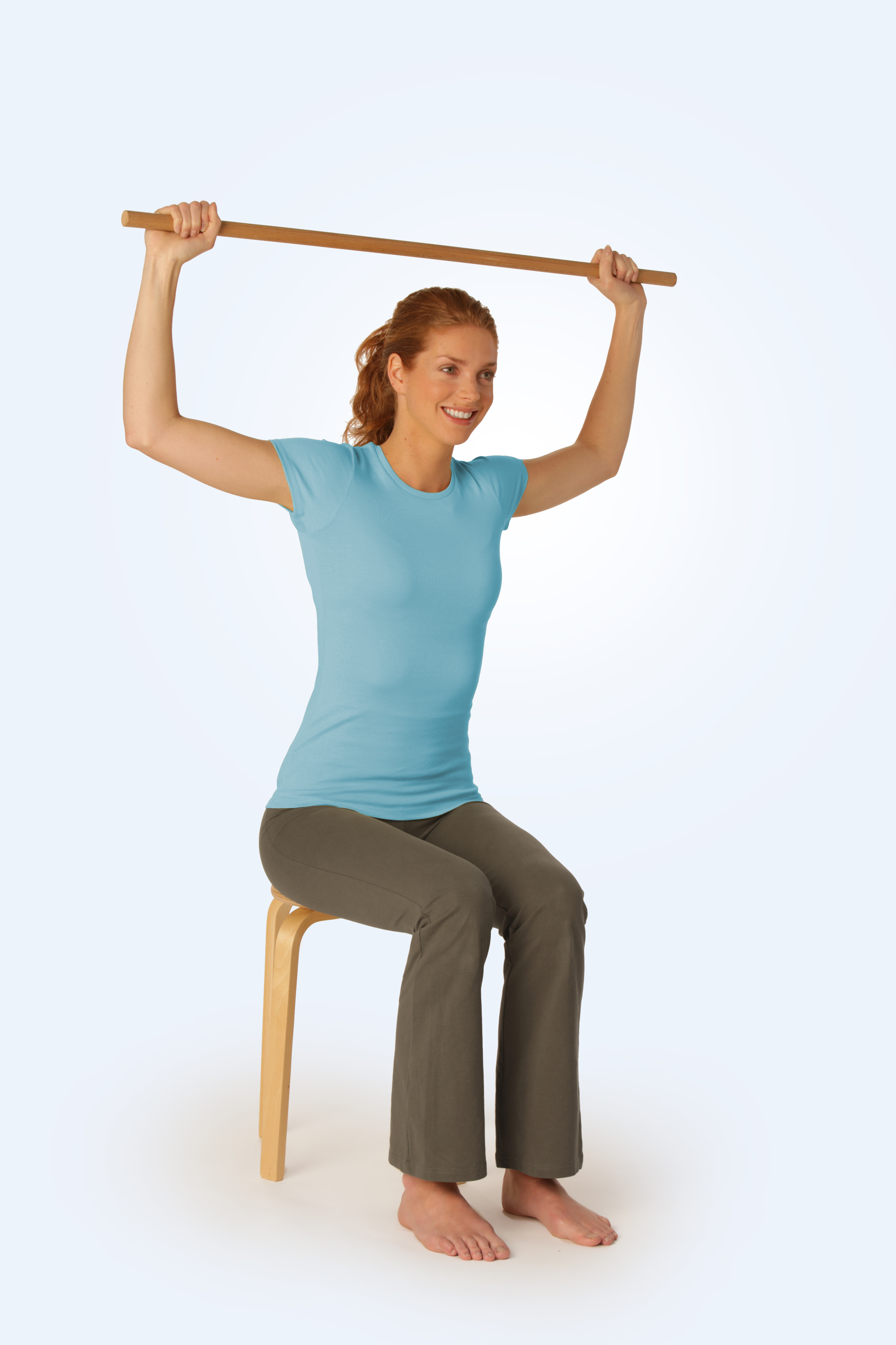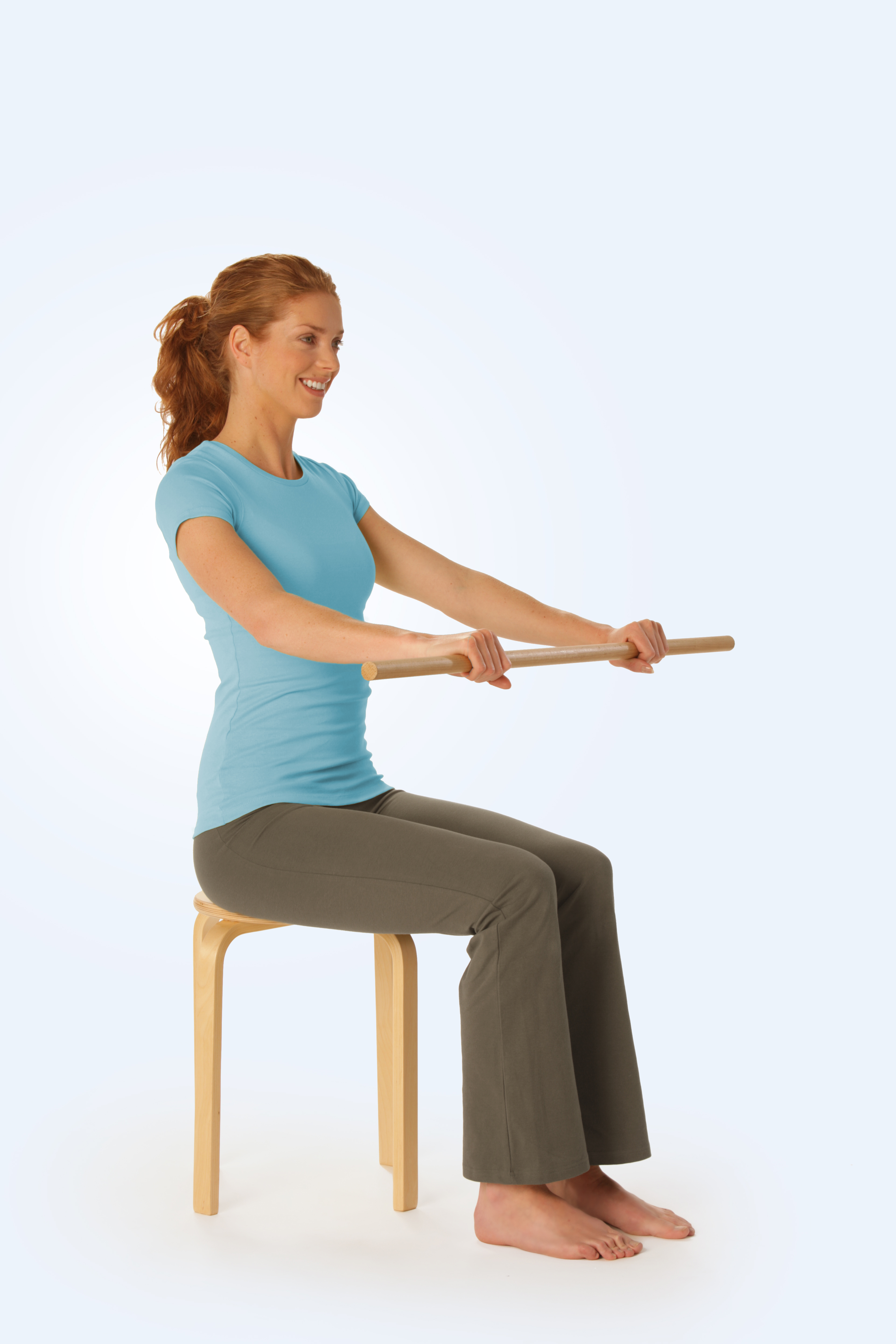 Exercise 4 - Sit upright on a chair and stretch your arms forwards. Shake the Brasils for about 30 seconds with short, fast chopping movements. This trains the muscles of your upper arms and back. Picture: AGR e. V.