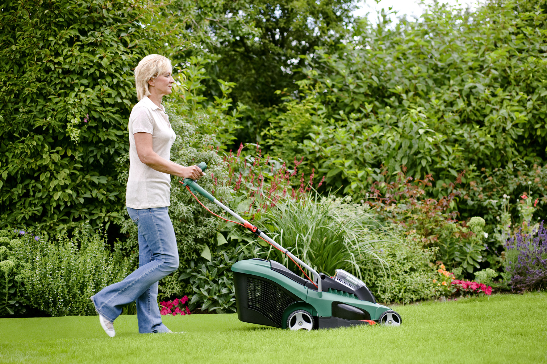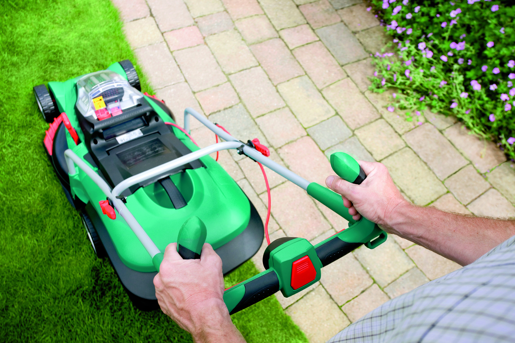 Mowing the lawn with the AGR-tested "Rotak" electric lawnmower by Bosch: easy and back-friendly, thanks to the consistently ergonomic concept. Picture: AGR/Bosch