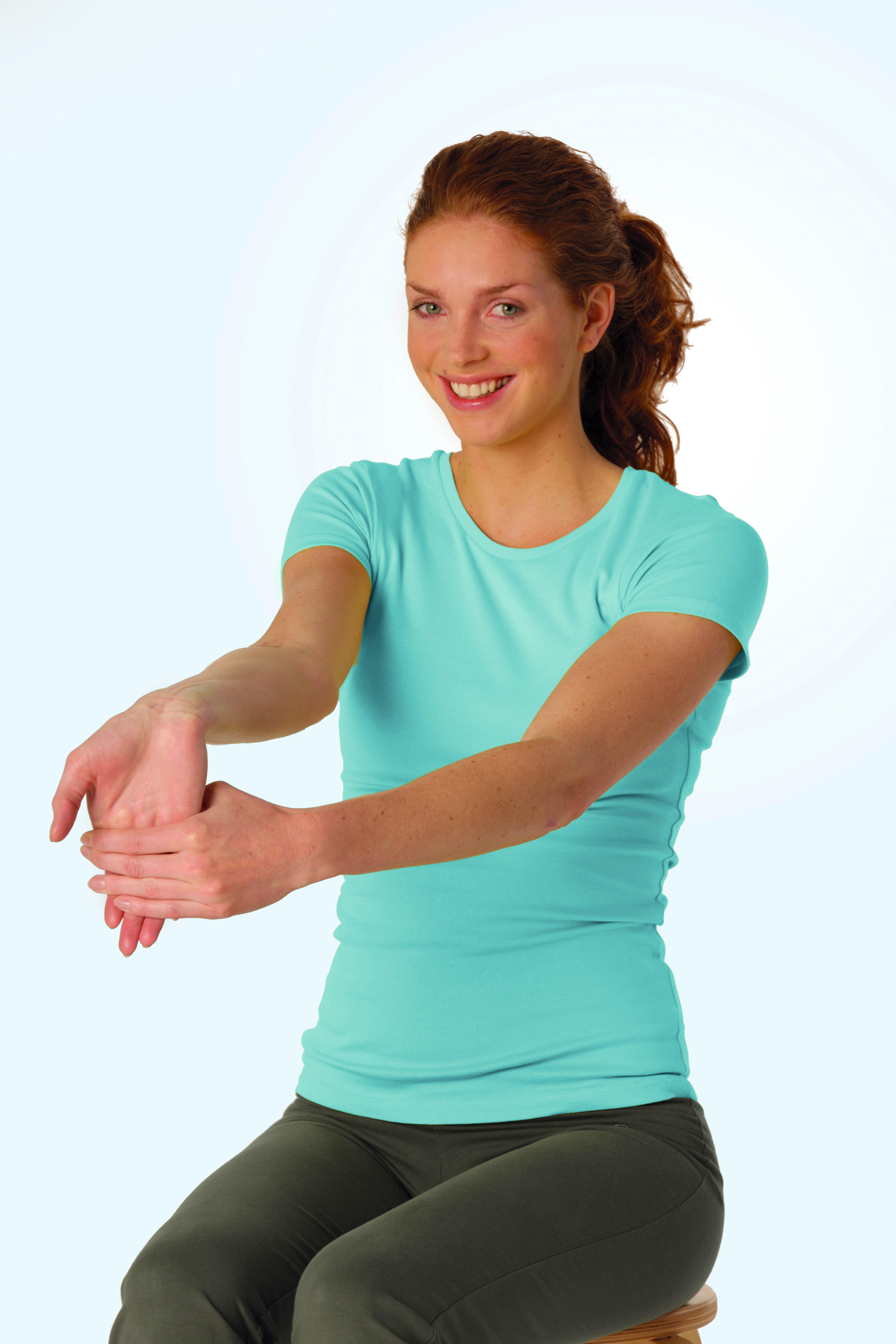 Exercise 2 - Stretching your upper arms. Stretch your right arm over your head then bend it at the elbow; with your left hand, grasp your elbow joint and pull it towards your left shoulder. Hold the tension for about ten seconds, then repeat for the other side. Picture: AGR e. V.