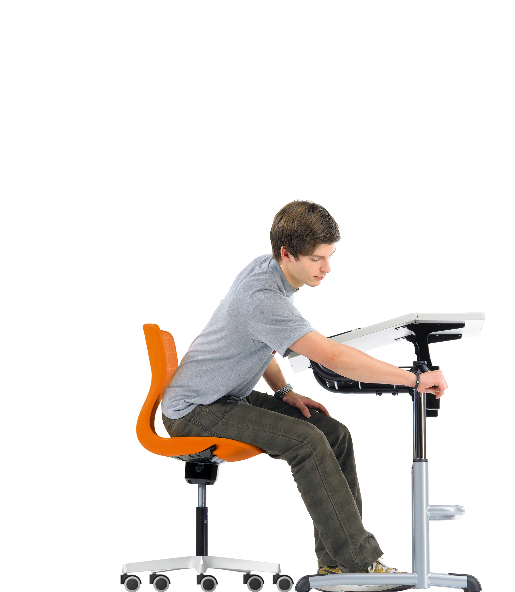 Sitting still for hours is very unnatural behaviour for all generations. This applies particularly to children as they need many development stimuli in the form of a wide range of exercise particularly during their maturing processes. A healthy child will also demand such exercise stimuli - just one reason why children often find it hard to sit still and will start to fidget or rock back and forth on their chair. This is the growing organism's natural, healthy "strategy" in protest against these unhealthy conditions. On the contrary, sitting for hours and sitting still in particular is stress for the back, for the mind and soul. Primary school children can sit still for maximum five minutes. They need a chair that takes account of their healthy agitation rather than blocking their instincts, and they should work at a standing desk more frequently.