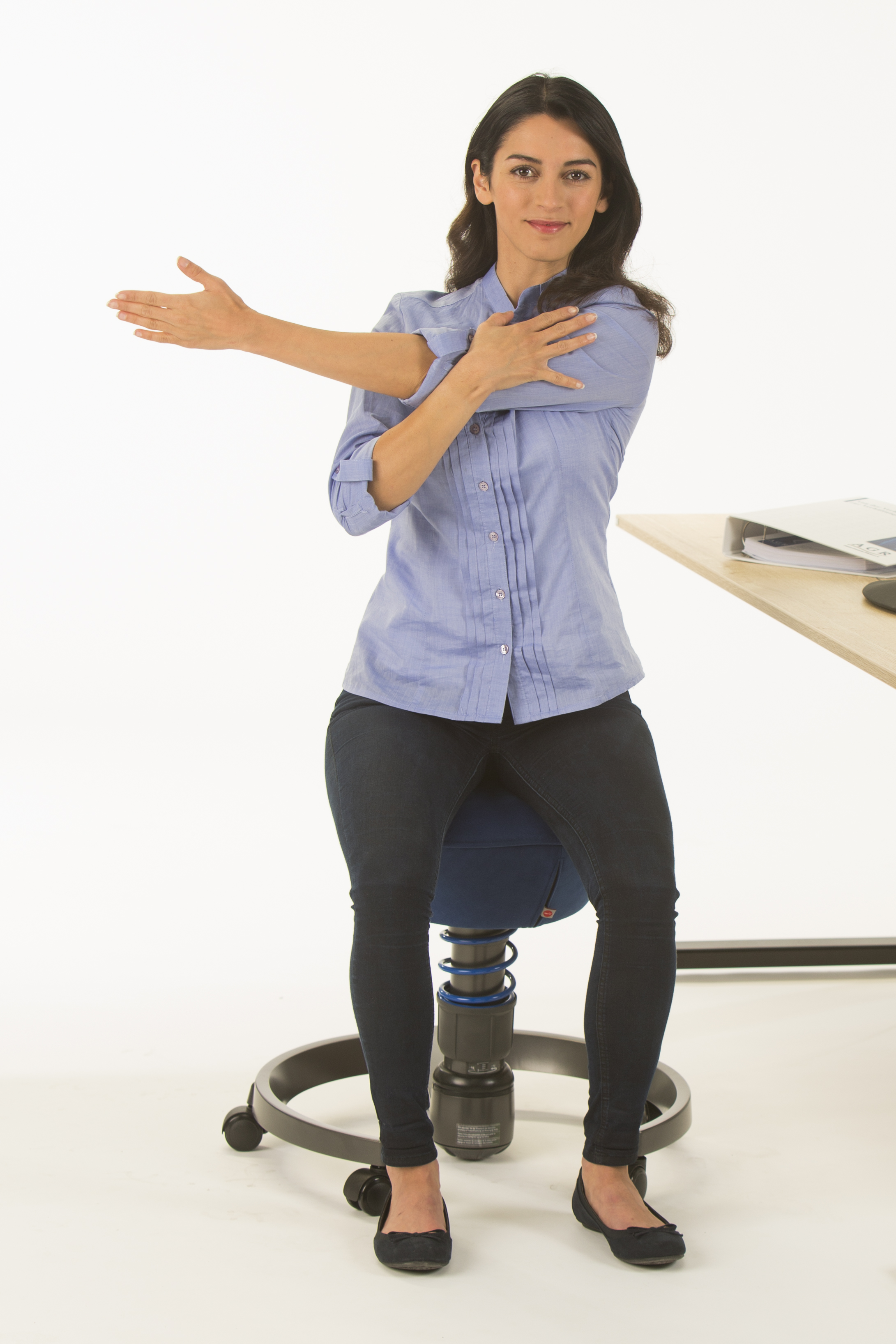Stretching your shoulders. Brief stretching helps to prevent tension. To stretch your back and shoulders, stretch your arms upwards, grasp your left wrist with your right hand and pull your left arm to the right. Hold the tension for a few seconds, then change to the other side.