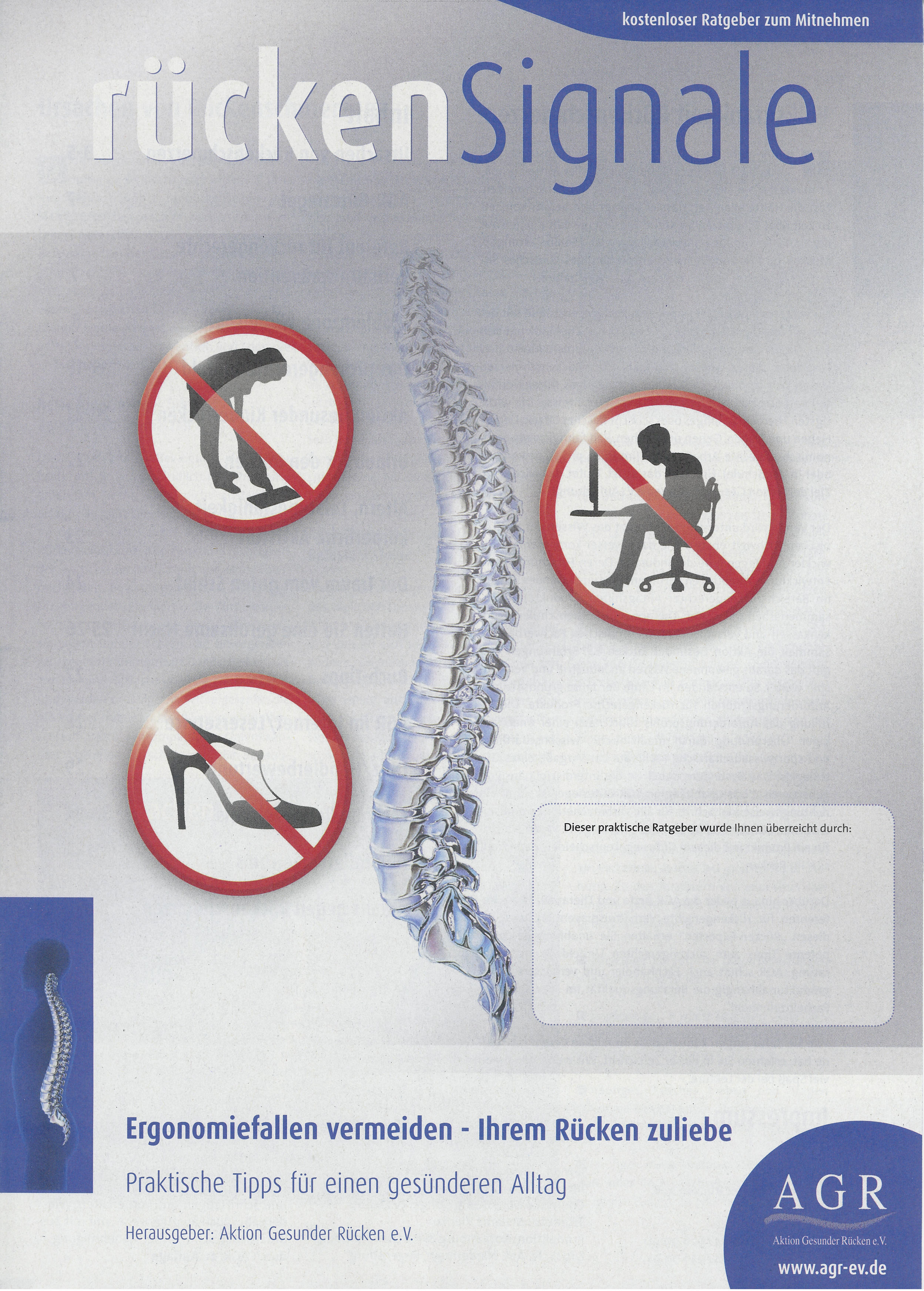 (lifepr) (Selsingen, 17.11.2009) Rückenschmerzen - für viele von uns gehören sie zum täglichen Leid. Doch das muss nicht sein. Mit dem richtigen Verhalten und ergonomisch gestalteten Gebrauchsgegenständen lassen sich viele Rückenbeschwerden vermeiden bzw. lindern. Hilfreiche Tipps für eine rückenfreundliche Alltagsgestaltung gibt die neue Ausgabe des kostenlosen Ratgebers "rückenSignale" der Aktion Gesunder Rücken e. V. (AGR), deren unabhängiges Gütesiegel besonders rückengerechte Produkte auszeichnet.