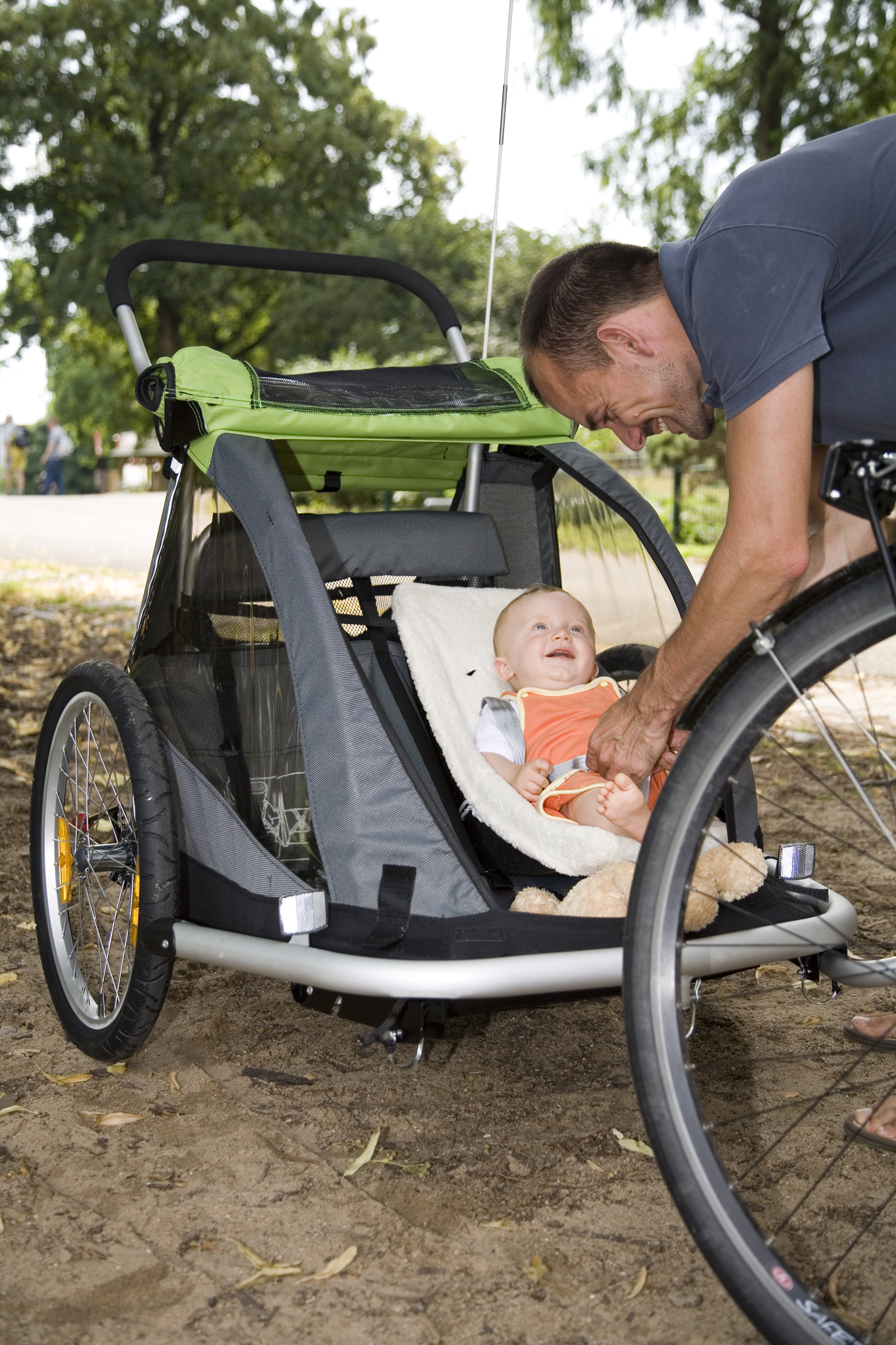 Keiner käme auf die Idee, einen Kinderwagen ohne Federung zu kaufen und so achten immer mehr Eltern auch beim Kinderanhänger fürs Fahrrad auf Komfort. Neben gefederten Modellen, wie sie der Marktführer Chariot (www.chariot.de) im Programm hat, bietet sich auch der so genannte "Babysitz" an. Der funktioniert ähnlich einer Hängematte und wird in den Kinderanhänger eingehängt und federt die Belastungsspitzen heraus. "Mit dem Babysitz können Kinder ab acht Wochen sicher und bequem im Kinderanhänger mitfahren", erklärt Reiner Kolberg vom Kindertransporterspezialisten Zwei plus zwei (www.zweipluszwei.com). Clever: Der Babysitz lässt sich individuell anpassen und wächst bis zum Kinderalter von etwa 16 Monaten mit.