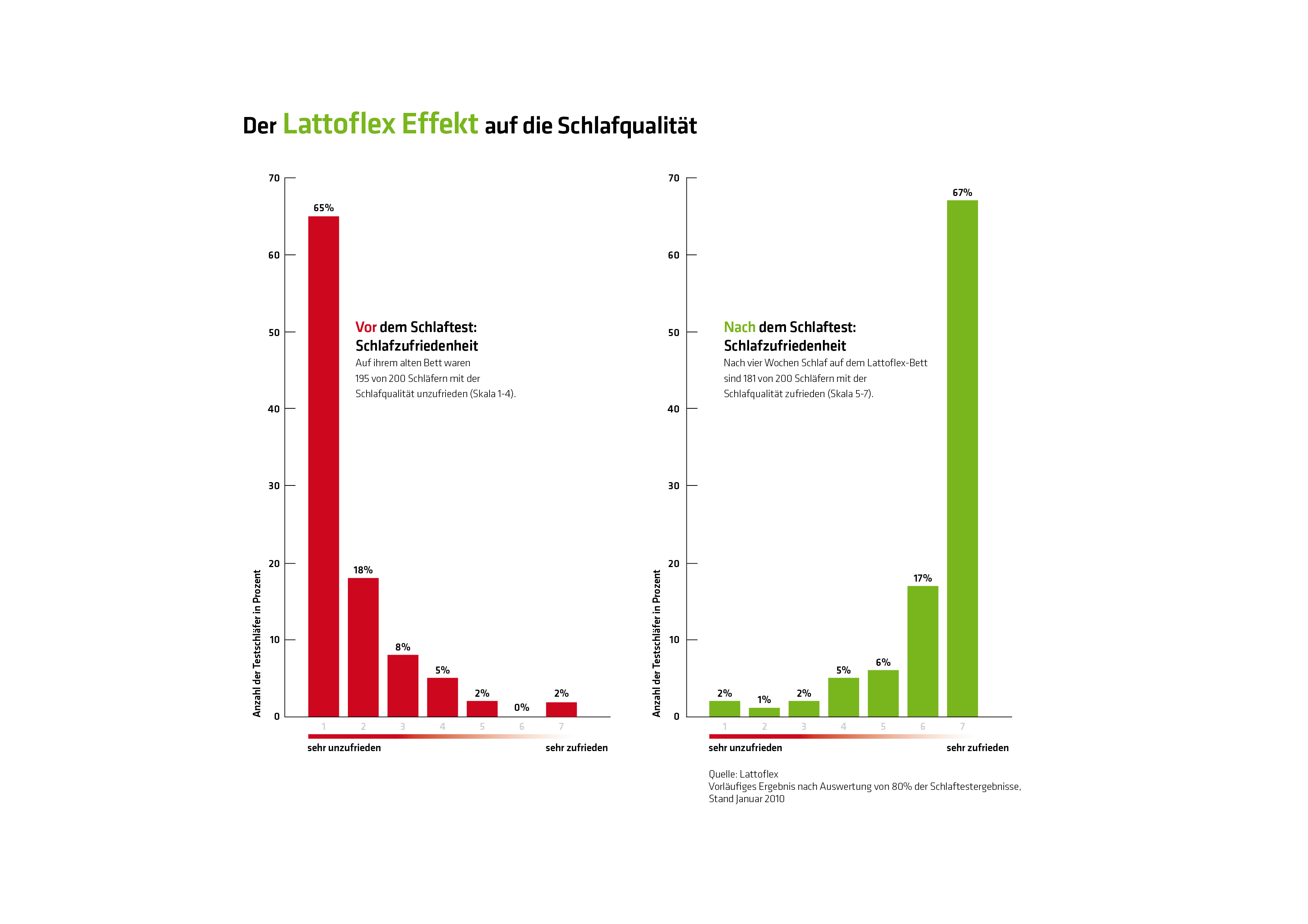Den Zusammenhang zwischen der Schlafqualität und einem rückengerechten Bettsystem hat jetzt Deutschlands größter Schlaftest eindrucksvoll bewiesen. Aus 70.000 Bewerbern wurden 250 Personen ausgewählt, die häufig nach dem Aufstehen Rückenschmerzen verspürten und mit der Qualität ihres Schlafes sehr unzufrieden waren. Die Testschläfer bekamen ein Lattoflex Bettsystem zur Verfügung gestellt und sollten zu Beginn und am Ende der Testphase die Häufigkeit ihrer Rückenschmerzen und den Grad ihrer Schlafqualität angeben. Die Ergebnisse nach der Auswertung von 200 Fragebögen sind signifikant: 91,2 Prozent der Probanden, die zu Beginn der Studie noch häufig bis regelmäßig unter Rückenschmerzen litten, vermerkten einen deutlichen Rückgang ihrer Beschwerden. Bei 90,25 Prozent der Testschläfer verbesserte sich durch das neue Bettsystem mit Senso-Flügeln die Schlafqualität erheblich. Die Testergebnisse machen deutlich: Das Prinzip des starren Holzlattenrosts hat ausgedient. Nur eine punktgenaue Unterstützung des Rückens im Schlaf sorgt für eine erholsame Nachtruhe und volle Leistungsfähigkeit im Alltag.