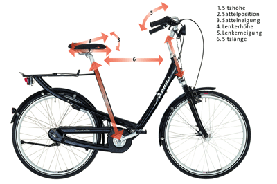 Die optimale Sitzposition für Ihren Rücken ergibt sich aus sechs verschiedenen Parametern, die bei einem guten Fahrrad individuell verstellbar sein müssen. Im einzelnen sind dies Sitzhöhe (1), Sattelposition (2), Sattelneigung (3), sowie Lenkerhöhe (4) und -neigung (5) sowie Sitzlänge (6).