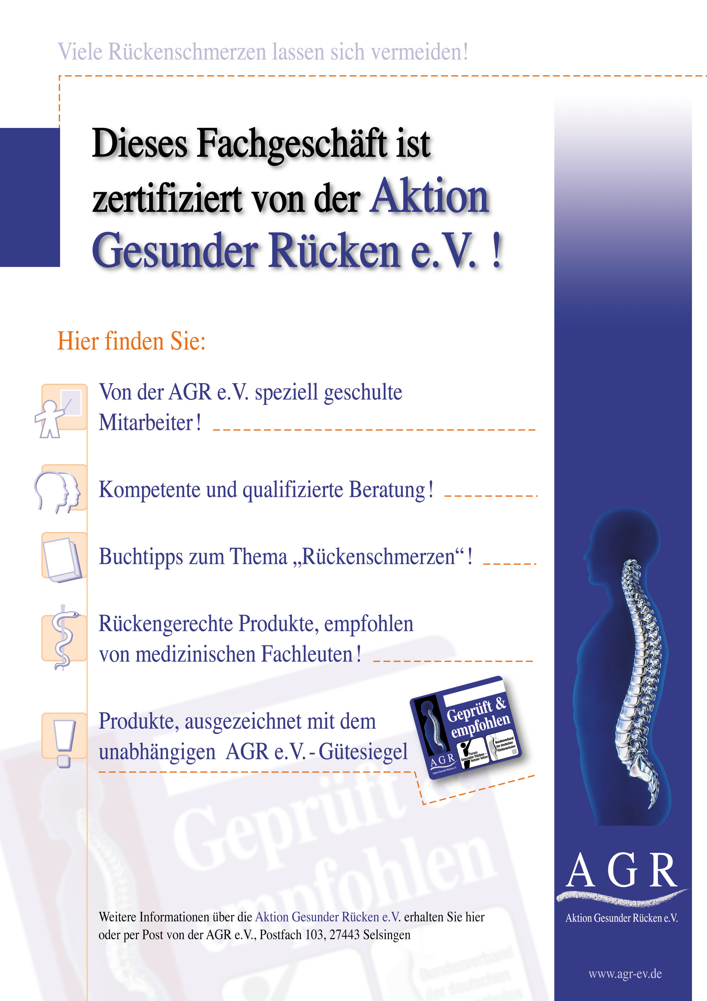 Auf Anfrage versendet die AGR zum Preis von 9,95 Euro ein Infopaket, bestehend aus der umfangreichen Broschüre "Ergonomie-Ratgeber" sowie der Zeitschrift "Rücken Signale". Diese enthält eine Liste aller geprüften Fachgeschäfte. Letztere gibt es auch im Internet unter www.agr-ev.de.