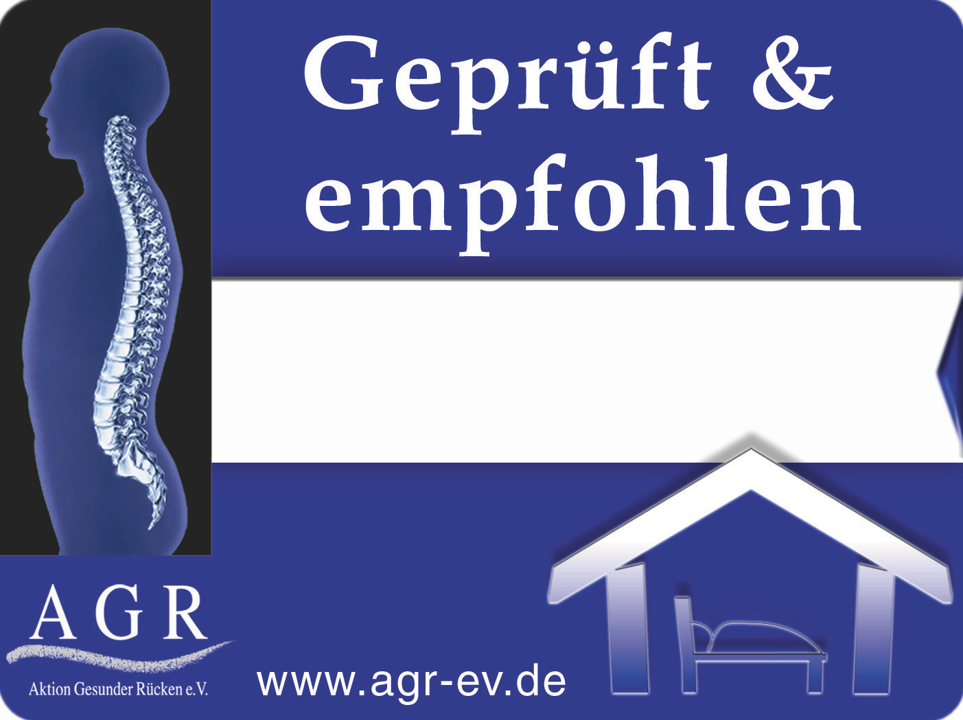 Hierfür wurde extra das "AGR-Hotel-Gütesiegel" entwickelt. Dieses Gütesiegel wird an Hotels vergeben, die sich von der AGR auf fachlich definierte Mindeststandards hinsichtlich der Ausstattung überprüfen lassen. Das bedeutet, dass die Bettausstattung und auch die sonstige Zimmereinrichtung aus rückenfreundlichem Mobiliar bestehen.
