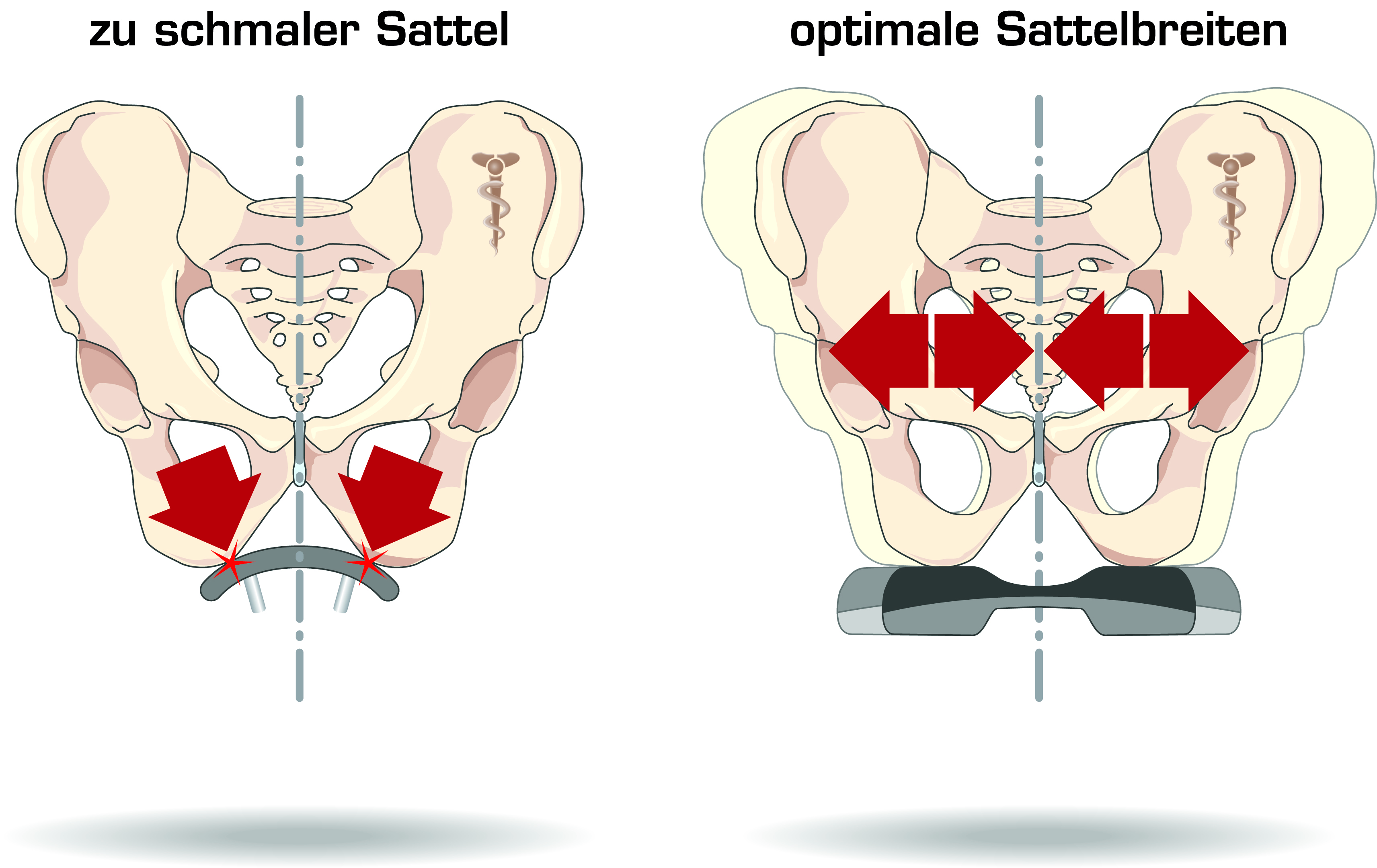 - Je aufrechter die Sitzposition, desto mehr Gewicht lastet auf dem Sattel. Die Gesäßhöcker werden mit der Tretbewegung abwechselnd noch stärker belastet, weshalb auch der Sattel sich diesen Bewegungen unbedingt anpassen sollte. Aus diesem Grund ist ein bequemer Sattel nicht nur bei Langstrecken ein absolutes Muss. Die neue Satteltechnologie vom Ergonomiespezialisten SQlab (www.sq-lab.com) gewährleistet beispielsweise die Mitbewegung des Beckens und minimiert mögliche Beschwerden der Lendenwirbelsäule, des Beckens und der Hüfte. Darüber hinaus kompensiert eine dynamische Sattelkonstruktion beispielsweise Unterschiede wie Beinlängendifferenzen. Am besten testet man den Sattel bei einer ausgiebigen Probefahrt. Dank professioneller Beratung lässt sich schnell ein geeignetes Modell für die individuellen Anforderungen finden, in dem zunächst der Sitzknochenabstand vermessen wird. Um den individuell passenden Sattel zu bestimmen, misst der Fachhändler den Sitzknochenabstand des/der Radler/-innen. Denn nur wenn die Sitzknochen auf dem Sattel (und nicht außerhalb) liegen, können sie das Körpergewicht aufnehmen und den Dammbereich vom Druck entlasten. Die bestens angepasste Sattelform bringt allerdings nichts, wenn die Sattelneigung nicht korrekt eingestellt ist. Wenn die Radler/-innen auf den Sitzknochen sitzen, klemmt die Sattelnase auch auf längeren Touren keine Nerven ein.