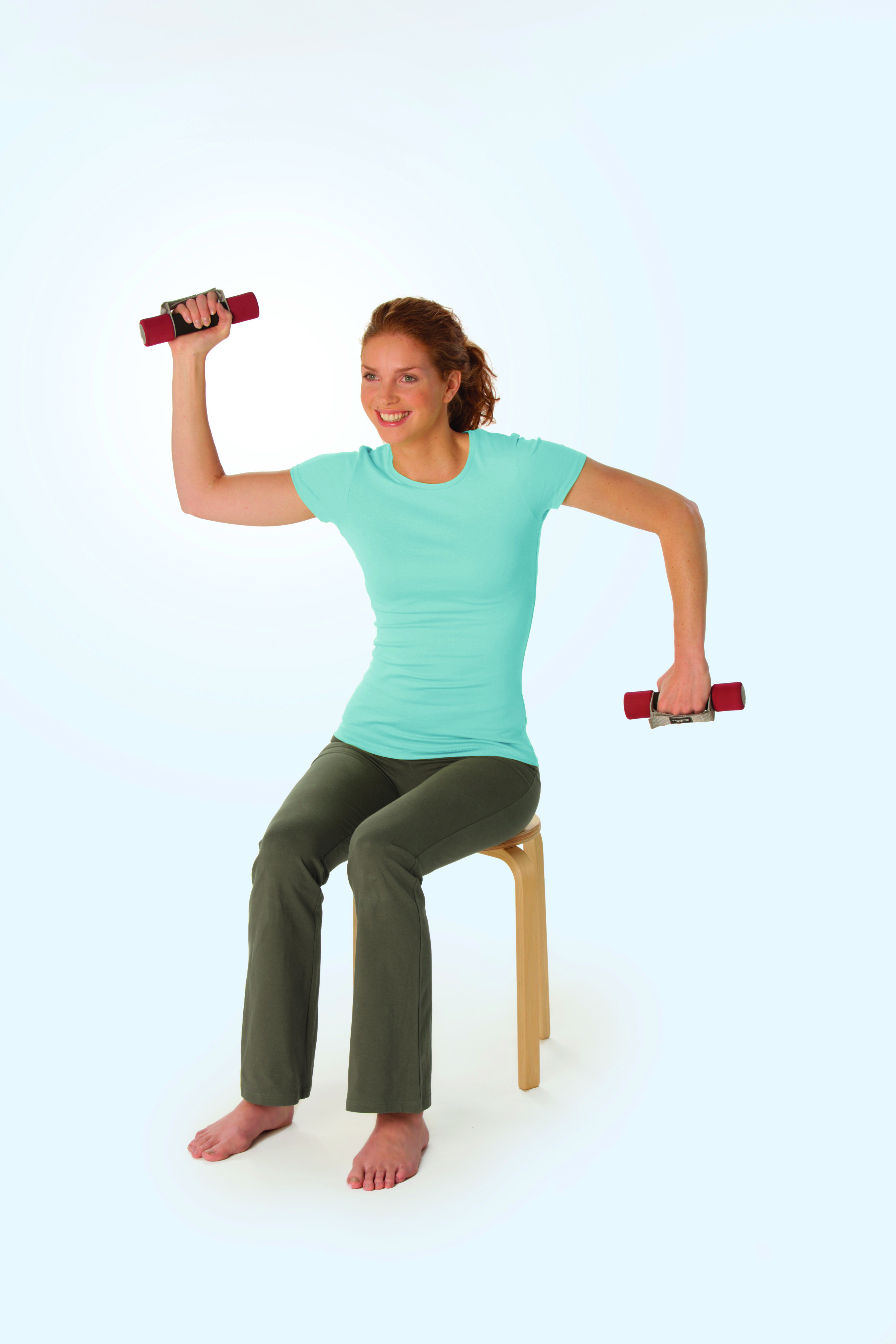 Winkeln Sie die Ellenbogen erneut an und heben die Arme seitlich nach oben. Anschließend die Arme im Wechsel in den Schultergelenken nach oben und unten drehen. Die Bewegungen ca. 10 Mal durchführen.