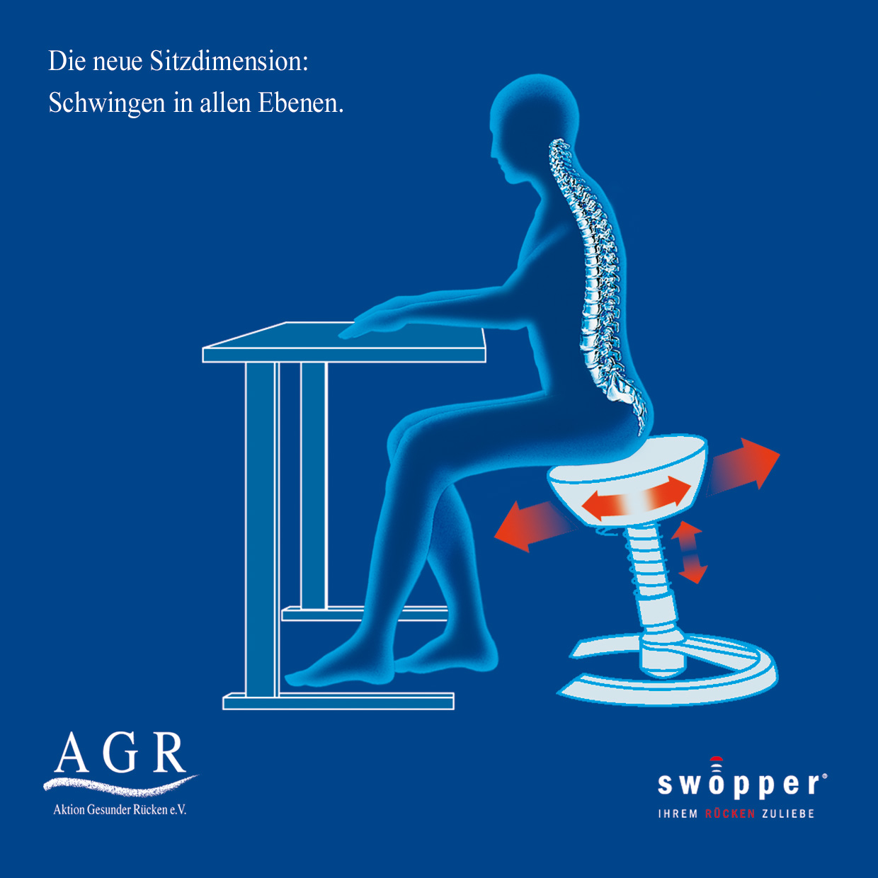 Wissenschaftlich erwiesen ist, dass z. B. der 3D-Aktiv-Stuhl swopper mehr als doppelt so viel Bewegung beim Sitzen möglich macht wie normale Bürostühle. Das aktive Sitzen auf dem federgelagerten Sitz hält die Muskulatur aktiv, ist gut für die Haltung, entlastet die inneren Organe und regt den Kreislauf an. Und weil diese Art der Bewegung - spontan und intuitiv - dem natürlichen Bewegungsdrang des Menschen entspricht, ist das aeris-Konzept der 3D-Ergonomie auch mit der Auszeichnung "besonders bewegend" von der Bundesarbeitsgemeinschaft für Haltungs- und Bewegungsförderung prämiert worden.