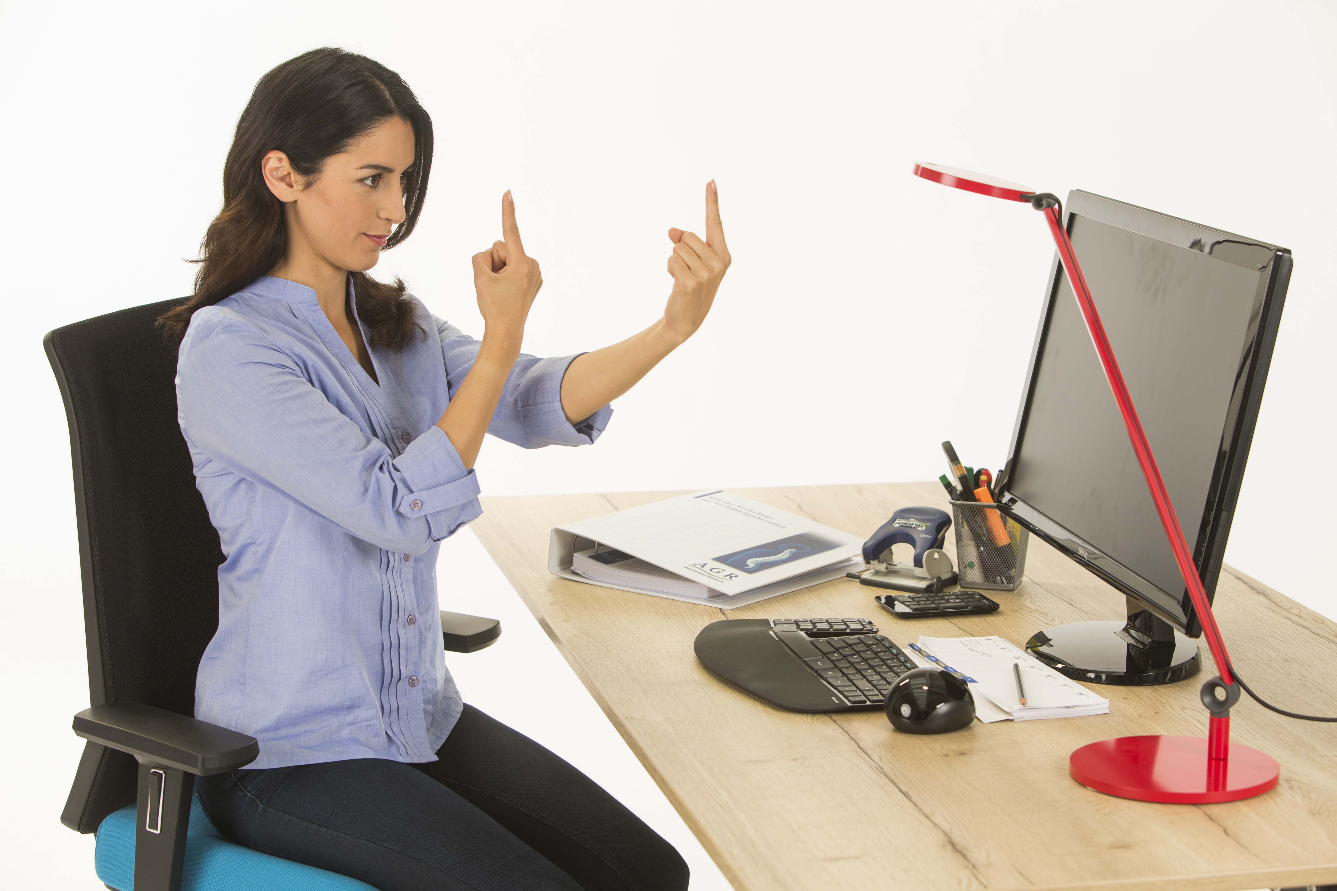 Nicht nur Rücken und Gelenke werden durch das stundenlange Sitzen im Büro beansprucht, sondern auch unsere Augen. Auf Dauer kann sogar die Sehleistung eingeschränkt sein. Zur Vorbeugung hilft ein Augentraining, zum Beispiel mit dieser Übung: Halten Sie einen Zeigefinger etwa 15 Zentimeter von Ihren Augen und den Zeigefinger der anderen Hand etwa doppelt so weit entfernt. Suchen Sie sich als dritten Fixpunkt einen Gegenstand in mehreren Metern. Fokussieren Sie dann abwechselnd den Zeigefinger der ersten, der zweiten Hand und schließlich den dritten Gegenstand. Anschließend entspannen Sie die Augen, indem Sie die Lider schließen und Ihre Hände mit den Fingerspitzen nach oben über die Augen legen. Nach etwa einer Minute können Sie die Augen wieder öffnen.