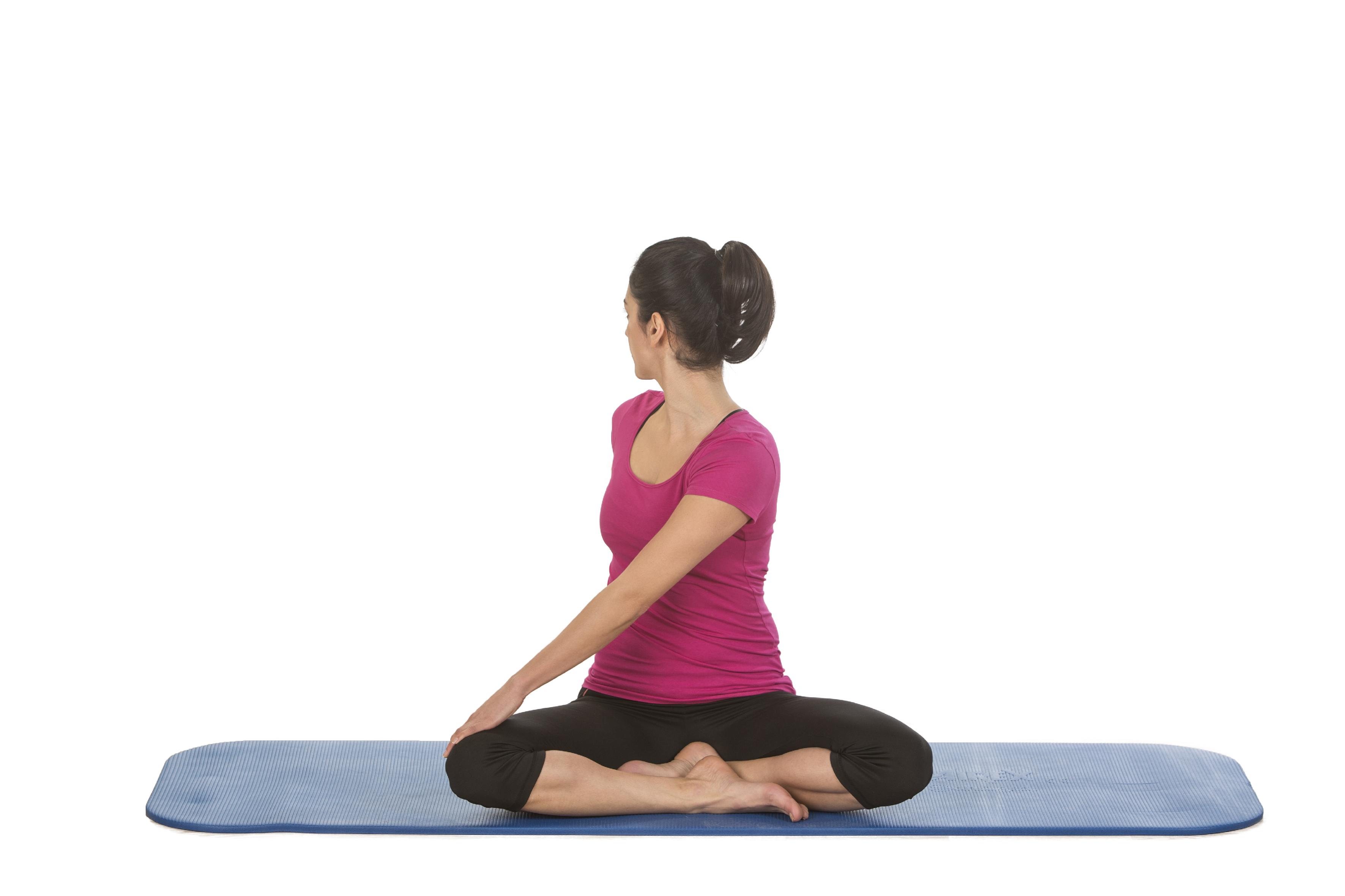 Setzen Sie sich aufrecht hin (Fortgeschrittene im Schneider- oder Lotussitz, Anfänger auf einen Stuhl/Hocker mit den Füßen auf dem Boden), legen die Hände auf die Knie, strecken die Wirbelsäule und atmen dabei tief ein. Während des Ausatmens die linke Hand auf das rechte Knie legen und den Oberkörper nach rechts drehen. Stellen Sie die rechte Hand hinter dem Becken auf. Beim Einatmen die Wirbelsäule strecken, bei nächsten Ausatmen die Drehung verstärken. Einige Atemzüge halten und anschließend mit der anderen Seite wiederholen.