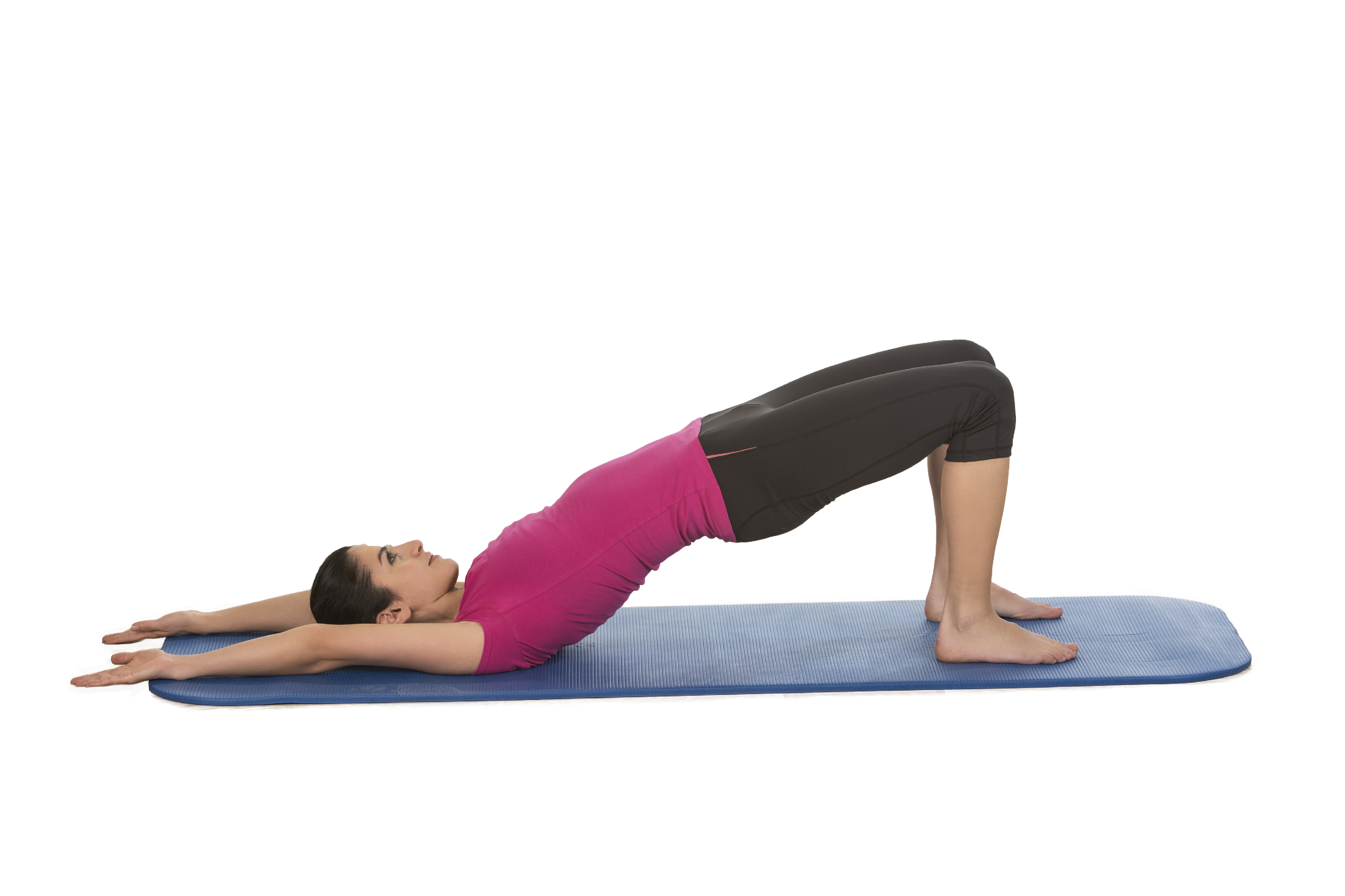 Stellen Sie in der Rückenlage die Füße hüftbreit auf, so dass Sie mit den Fingerspitzen die Fersen leicht berühren können. Führen Sie während des Einatmens die Arme über den Kopf oder breiten Sie sie auf Schulterhöhe aus und heben das Gesäß an. Halten Sie die Spannung und atmen einige Atemzüge tief ein und aus. Anschließend die Arme über den Kopf zurückführen, neben dem Körper ablegen und den Po zum Boden bringen.