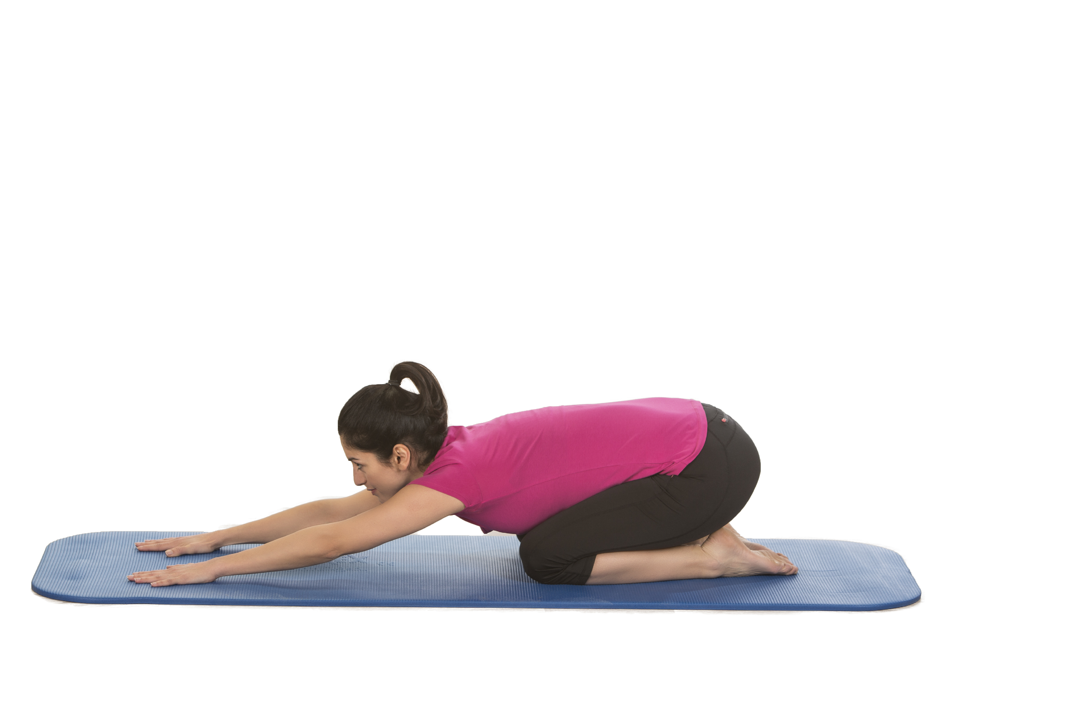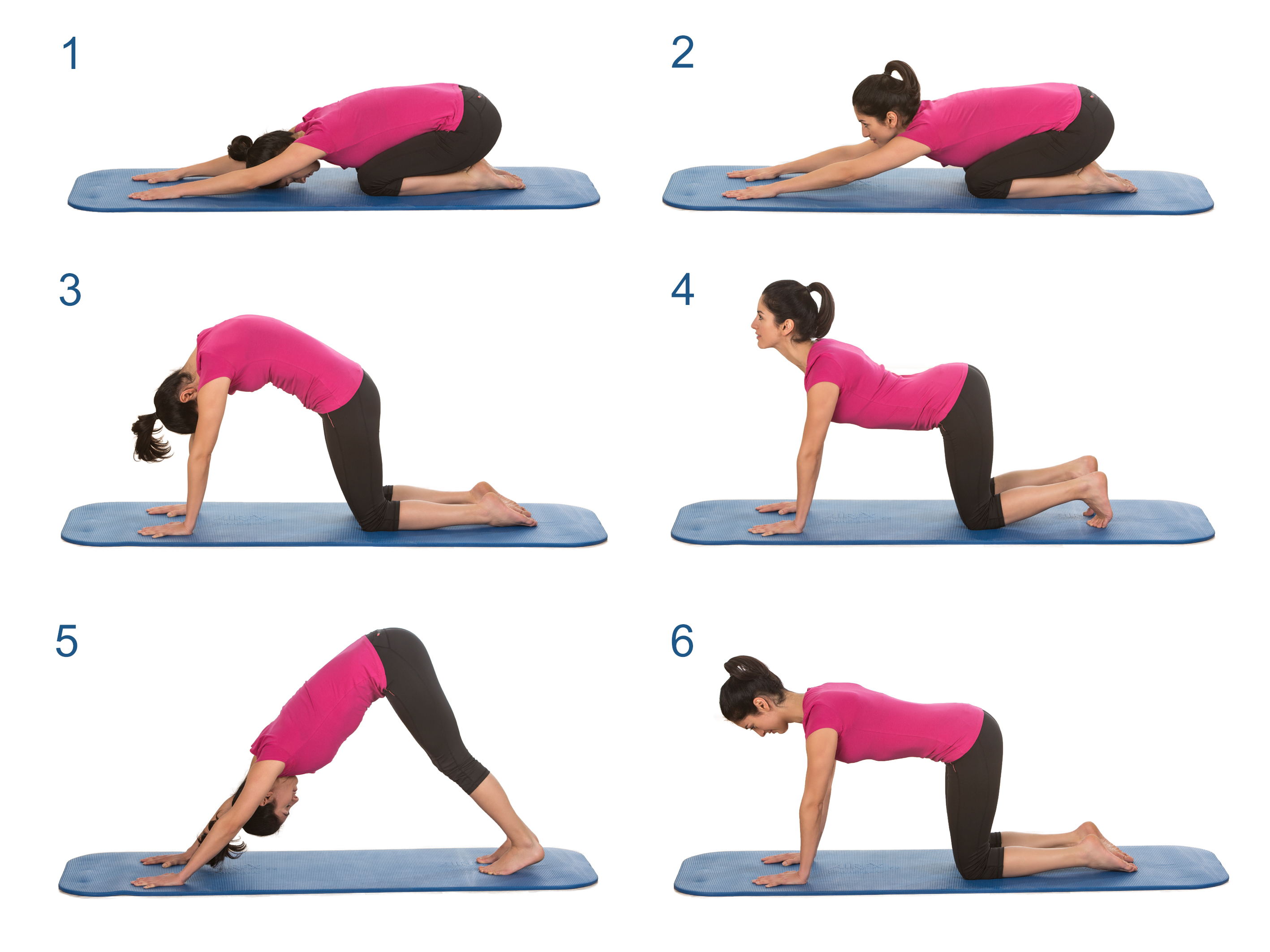 Starten Sie im Fersensitz, legen dann den Brustkorb auf die Oberschenkel, die Stirn auf die Matte und strecken die Arme nach vorne aus (1). Strecken Sie beim Einatmen die obere Wirbelsäule, heben den Brustkorb und Kopf an, der Nacken ist gestreckt (2). Gehen Sie beim Ausatmen in den Vierfüßlerstand und machen einen Katzenbuckel (3). Senken Sie beim anschließenden Einatmen den mittleren Rücken so weit ab, bis Sie ins Hohlkreuz gehen, der Brustraum weitet sich (4). Nur für Fortgeschrittene: Stellen Sie beim Ausatmen die Füße auf und nehmen Sie die Position des herabschauenden Hundes ein. Achten Sie dabei auf die Dehnung des Rückens und lassen Sie die Beine gebeugt, wenn es sich besser anfühlt (5). Halten Sie die Position für einige Atemzüge. Dann die Knie zum Boden bringen und in den Vierfüßlerstand gehen (6). Beginnen Sie die Übung nun von vorne und wiederholen Sie sie 5-mal.