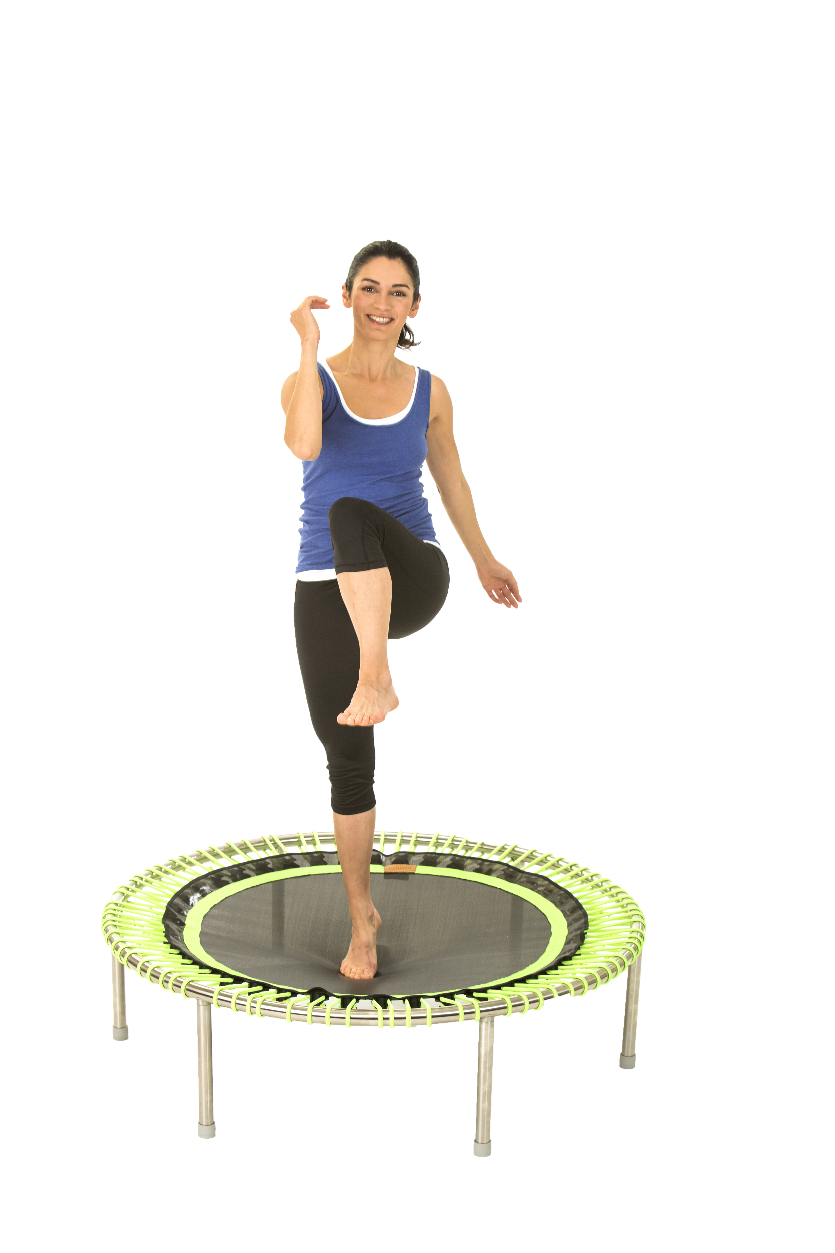Übung 2: Schwingen Sie für einige Minuten auf dem bellicon-Trampolin auf und ab, um sich zu lockern. Stehen Sie dann abwechselnd nur auf dem linken und rechten Bein und ziehen Sie dabei das gegenüberliegende Knie zum Ellenbogen.